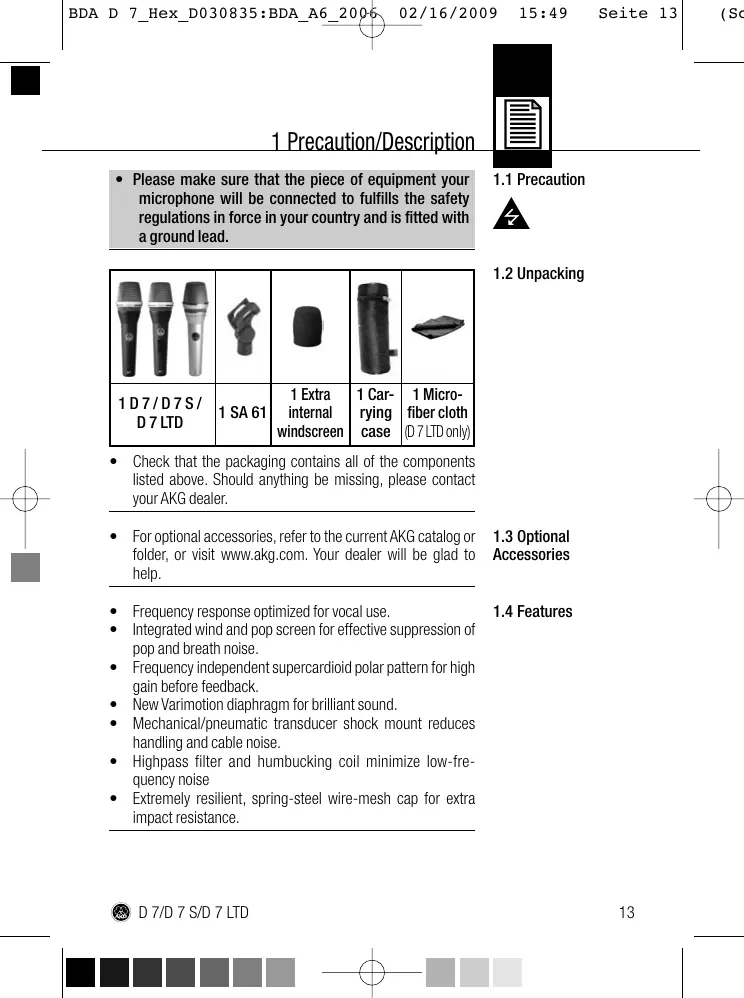 70 Hz to 20 kHz 80 Hz, permanently on 2.6 mV/Pa (-52 dBV re 1 V/Pa) 147 / 156 dB SPL 18 dB(A) to IEC 60268-4 ≤ 600 ohms ≥ 2000 ohms integrated 3-pin XLR D 7, D 7 S: matte gray-blue; D 7 LTD: chrome plated length: 185.2 mm (7.3 in.); diameter: 51 mm (2 in.) Net weight: 340 g (12 oz.) Shipping weight: 655 g (1.45 lbs.) Patents: Varimotion varying-thickness diaphragm for dynamic transducers (patents nos. AT 403.751, US 6.185.809, DE 814.637, DK 814.637, FI 814.637, FR 814.637, GB 814.637, IT 814.637, NL 814.637) This product conforms to the standards listed in the Declaration of Conformity. To order a free copy of the Declaration of Conformity, visit http://www.akg.com or contact sales@akg.com.