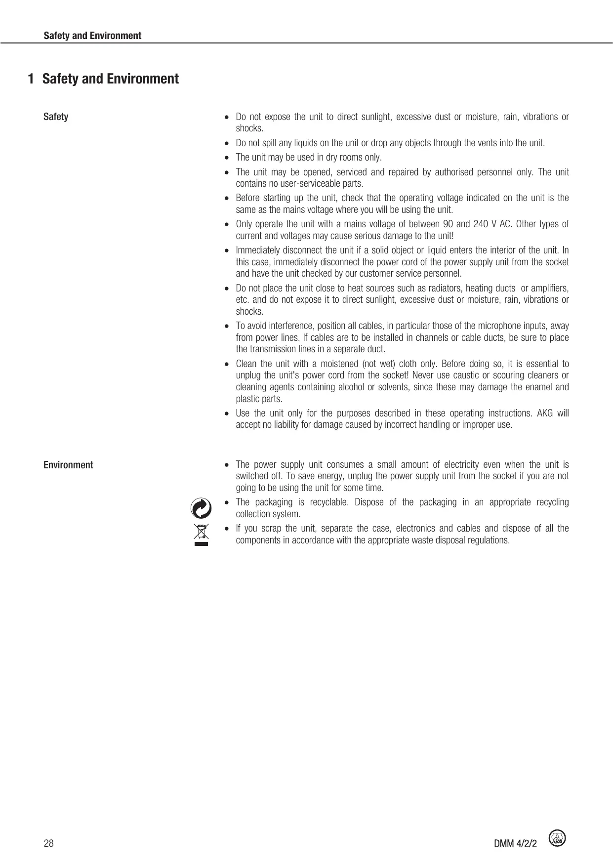 x Do not expose the unit to direct sunlight, excessive dust or moisture, rain, vibrations or shocks. x Do not spill any liquids on the unit or drop any objects through the vents into the unit. x The unit may be used in dry rooms only. x The unit may be opened, serviced and repaired by authorised personnel only. The unit contains no user-serviceable parts. x Before starting up the unit, check that the operating voltage indicated on the unit is the same as the mains voltage where you will be using the unit. x Only operate the unit with a mains voltage of between 90 and 240 V AC. Other types of current and voltages may cause serious damage to the unit! x Immediately disconnect the unit if a solid object or liquid enters the interior of the unit. In this case, immediately disconnect the power cord of the power supply unit from the socket and have the unit checked by our customer service personnel. x Do not place the unit close to heat sources such as radiators, heating ducts or amplifiers, etc. and do not expose it to direct sunlight, excessive dust or moisture, rain, vibrations or shocks. x To avoid interference, position all cables, in particular those of the microphone inputs, away from power lines. If cables are to be installed in channels or cable ducts, be sure to place the transmission lines in a separate duct. x Clean the unit with a moistened (not wet) cloth only. Before doing so, it is essential to unplug the unit's power cord from the socket! Never use caustic or scouring cleaners or cleaning agents containing alcohol or solvents, since these may damage the enamel and plastic parts. x Use the unit only for the purposes described in these operating instructions. AKG will accept no liability for damage caused by incorrect handling or improper use.