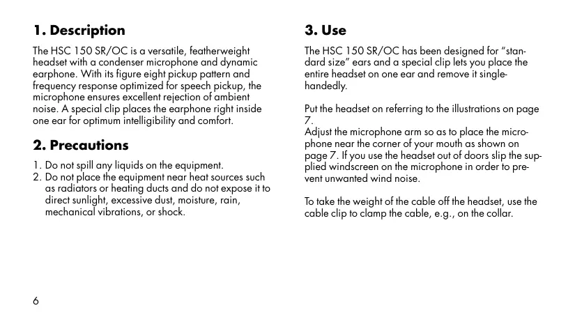 7. Adjust the microphone arm so as to place the microphone near the corner of your mouth as shown on page 7. If you use the headset out of doors slip the supplied windscreen on the microphone in order to prevent unwanted wind noise. To take the weight of the cable off the headset, use the cable clip to clamp the cable, e.g., on the collar.