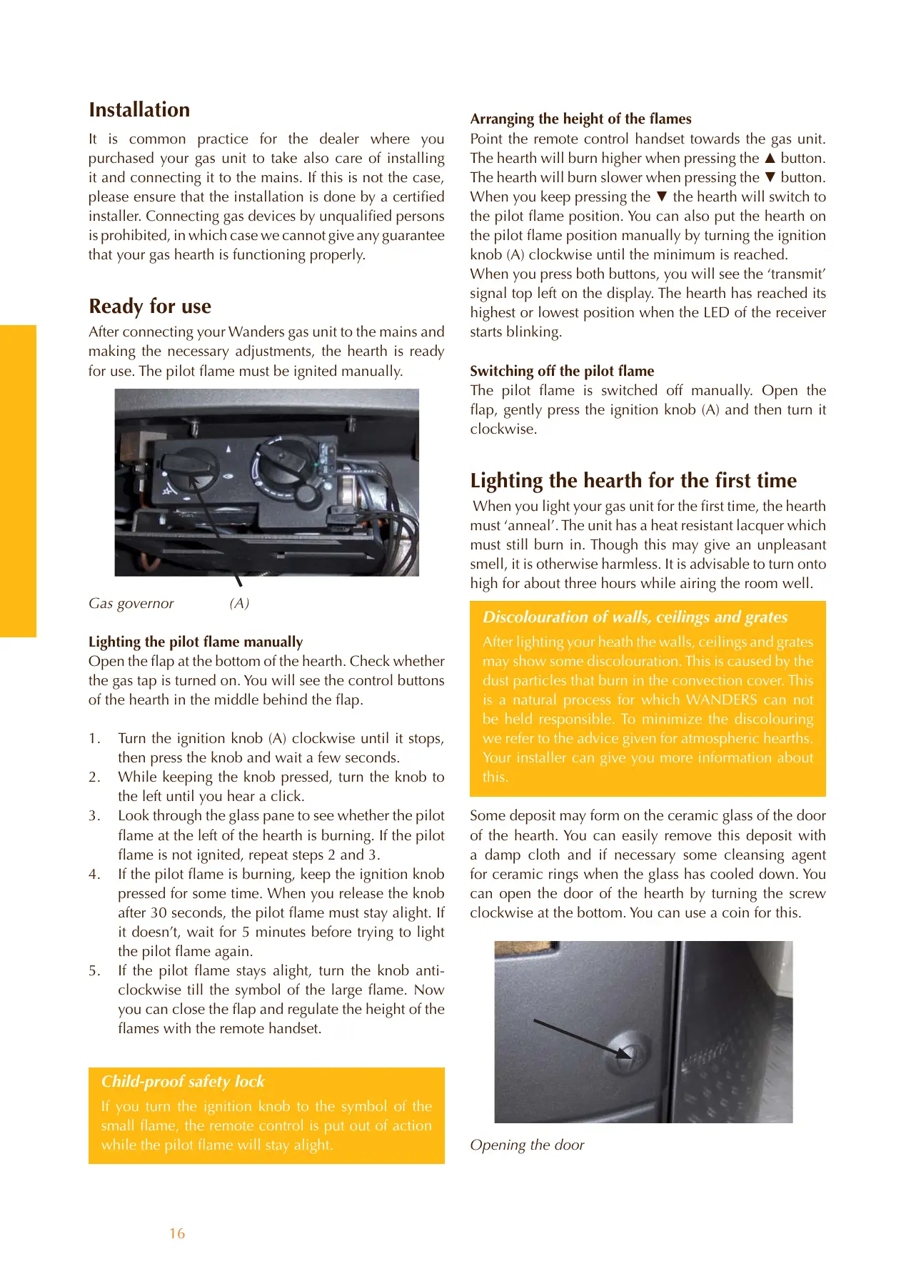 After connecting your Wanders gas unit to the mains and making the necessary adjustments, the hearth is ready for use. The pilot flame must be ignited manually.