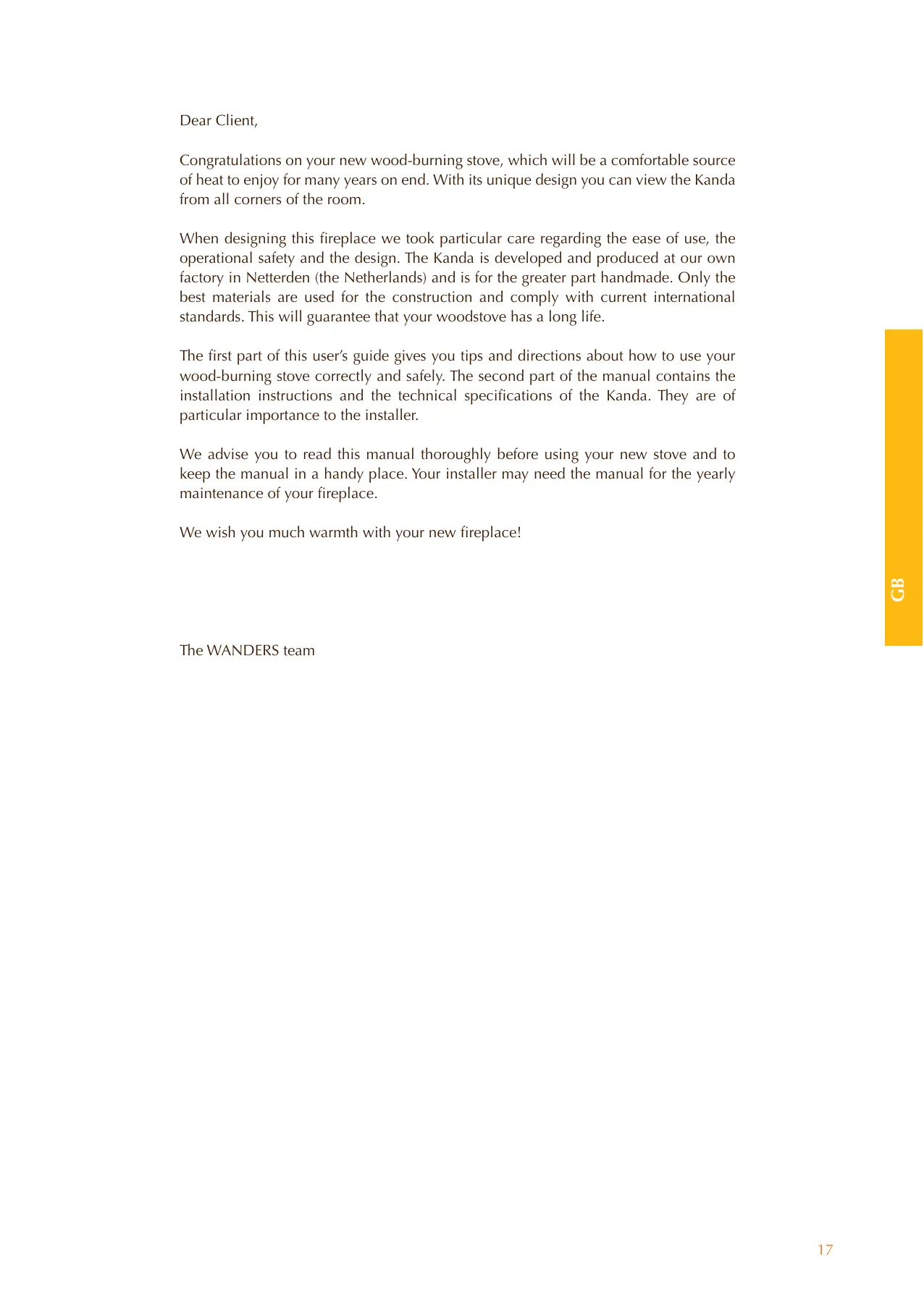 and with original parts. Guarantee WANDERS Metaalproducten B.V. in Netterden, the Netherlands, gives a guarantee of five years after the purchase date of your wood-burning stove, provided that the fireplace is properly installed and used in accordance with the instructions in the manual. The guarantee includes all defects which can be reduced to flaws in material and construction, in which case you will receive the new parts free of charge. Labour costs or other expenses are not covered by the guarantee. You can send defect parts (shipping paid) to WANDERS Metaalproducten B.V., Amtweg 4, 7077 AL in Netterden [The Netherlands]. Before installing your stove you must check if there is any visible damage to the unit. If there is, do not accept the unit and contact your supplier. Safety A WANDERS wood-burning stove gives you a comfortable and a safe source of heat in your home. Fire safety starts with a proper installation and a properly working flue tube. Your installer must therefore comply with the installation instructions as listed on page 23 and further. To burn your stove safely, the following points are important: