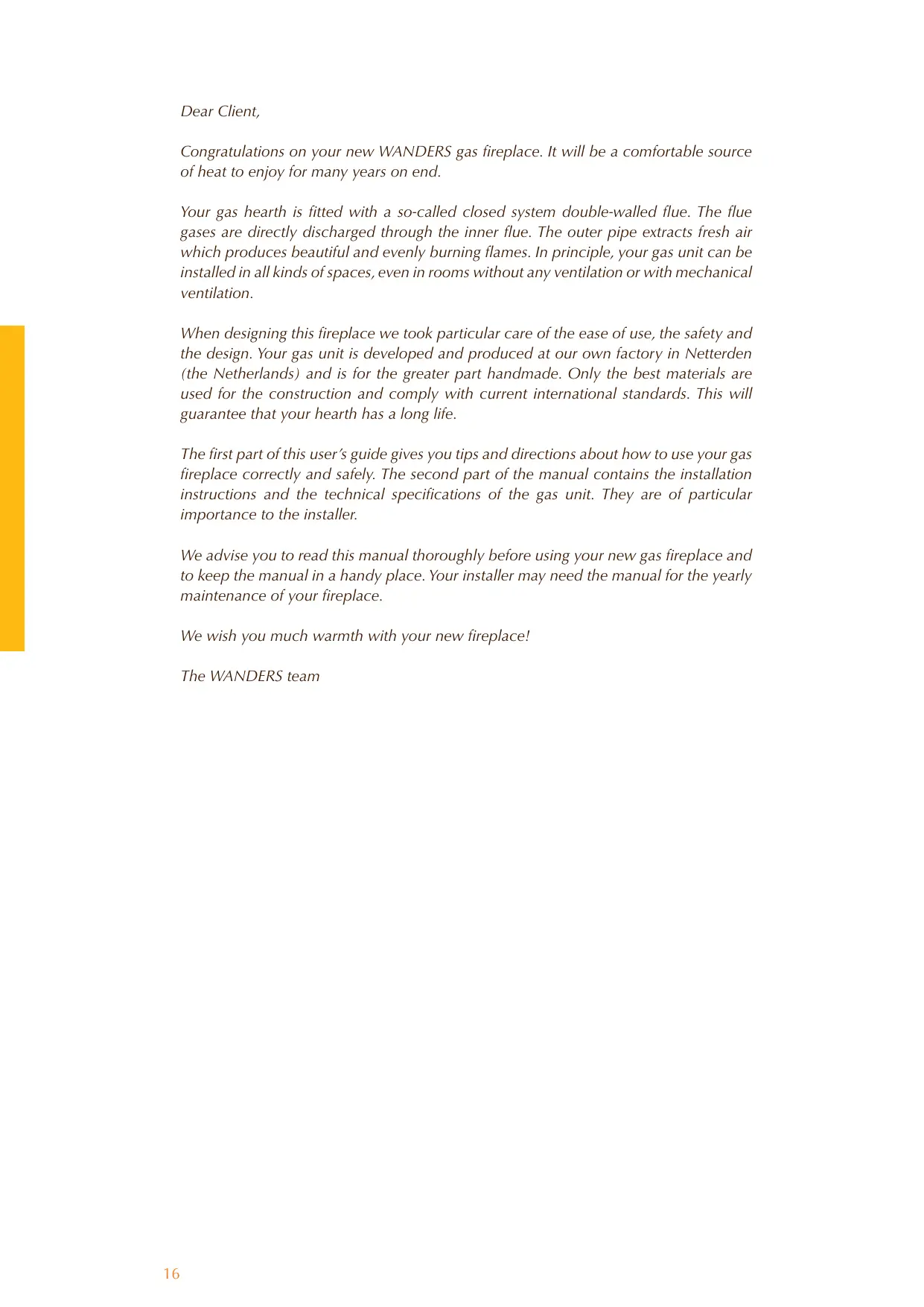 Congratulations on your new WANDERS gas fireplace. It will be a comfortable source of heat to enjoy for many years on end.