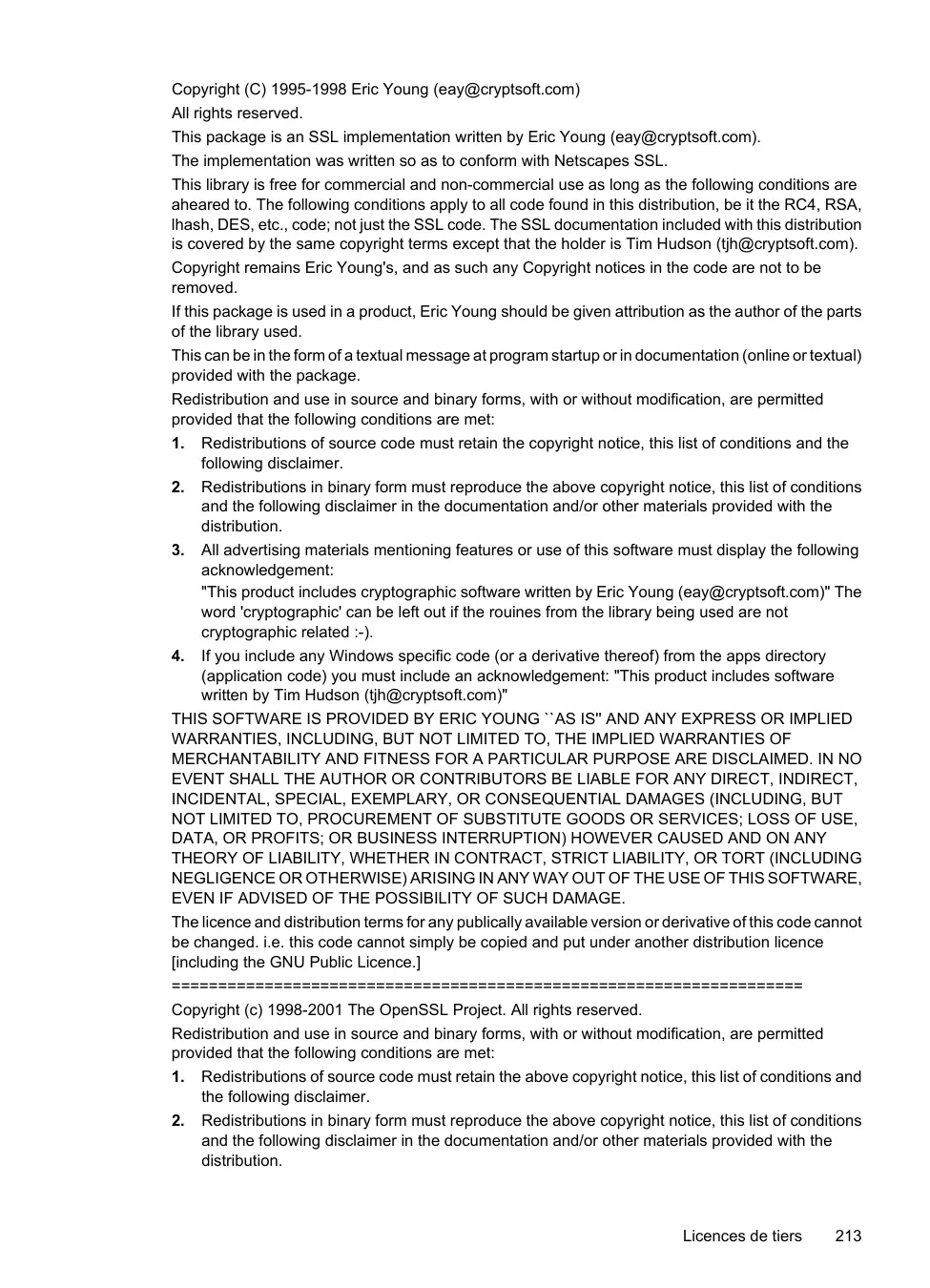 Renseignements techniques Copyright (C) 1995-1998 Eric Young (eay@cryptsoft.com) All rights reserved. This package is an SSL implementation written by Eric Young (eay@cryptsoft.com). The implementation was written so as to conform with Netscapes SSL. This library is free for commercial and non-commercial use as long as the following conditions are aheared to. The following conditions apply to all code found in this distribution, be it the RC4, RSA, lhash, DES, etc., code; not just the SSL code. The SSL documentation included with this distribution is covered by the same copyright terms except that the holder is Tim Hudson (tjh@cryptsoft.com). Copyright remains Eric Young's, and as such any Copyright notices in the code are not to be removed. If this package is used in a product, Eric Young should be given attribution as the author of the parts of the library used. This can be in the form of a textual message at program startup or in documentation (online or textual) provided with the package. Redistribution and use in source and binary forms, with or without modification, are permitted provided that the following conditions are met: