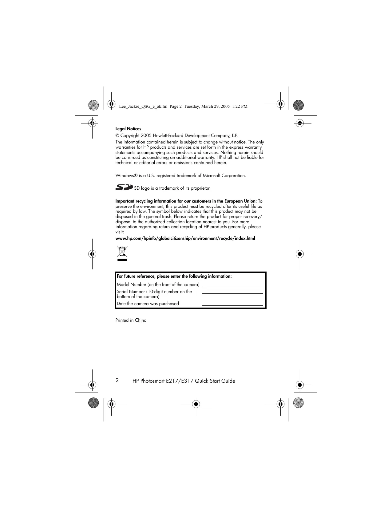 © Copyright 2005 Hewlett-Packard Development Company, L.P. The information contained herein is subject to change without notice. The only warranties for HP products and services are set forth in the express warranty statements accompanying such products and services. Nothing herein should be construed as constituting an additional warranty. HP shall not be liable for technical or editorial errors or omissions contained herein. Windows® is a U.S. registered trademark of Microsoft Corporation. SD logo is a trademark of its proprietor. Important recycling information for our customers in the European Union: To preserve the environment, this product must be recycled after its useful life as required by law. The symbol below indicates that this product may not be disposed in the general trash. Please return the product for proper recovery/ disposal to the authorized collection location nearest to you. For more information regarding return and recycling of HP products generally, please visit: www.hp.com/hpinfo/globalcitizenship/environment/recycle/index.html