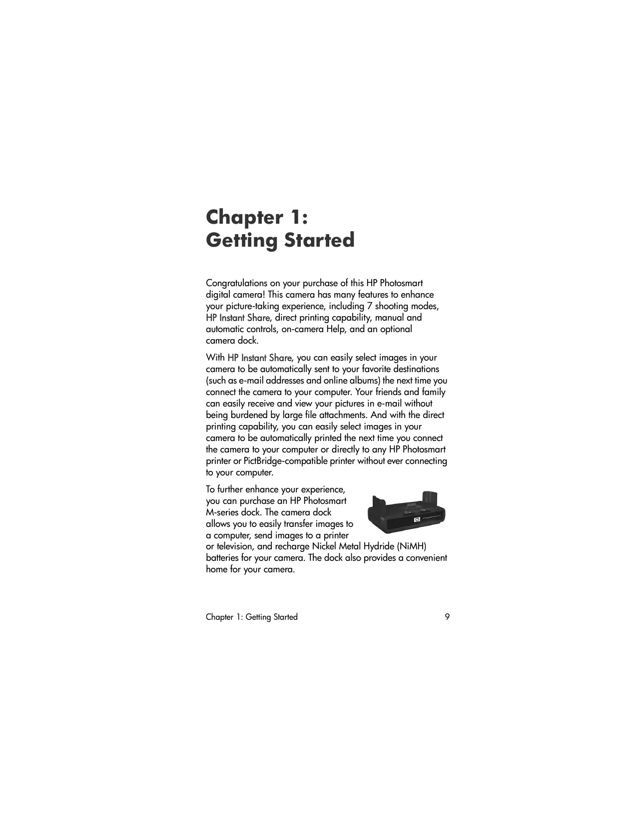 Congratulations on your purchase of this HP Photosmart digital camera! This camera has many features to enhance your picture-taking experience, including 7 shooting modes, HP Instant Share, direct printing capability, manual and automatic controls, on-camera Help, and an optional camera dock.