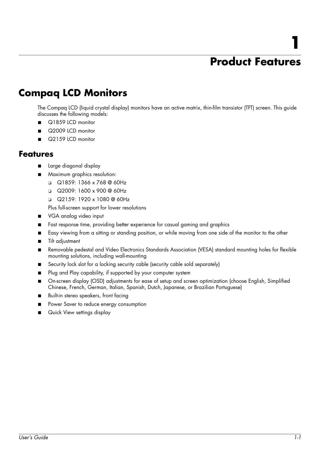 Compaq LCD Monitor: Preset Video Modes. LCD Monitor Quality and Pixel Policy Power Cord Set Requirements .