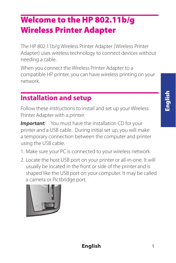 Follow these instructions to install and set up your Wireless Printer Adapter with a printer. Important: You must have the installation CD for your printer and a USB cable. During initial set up, you will make a temporary connection between the computer and printer using the USB cable. 1. Make sure your PC is connected to your wireless network. 2. Locate the host USB port on your printer or all-in-one. It will usually be located in the front or side of the printer and is shaped like the USB port on your computer. It may be called a camera or Pictbridge port.