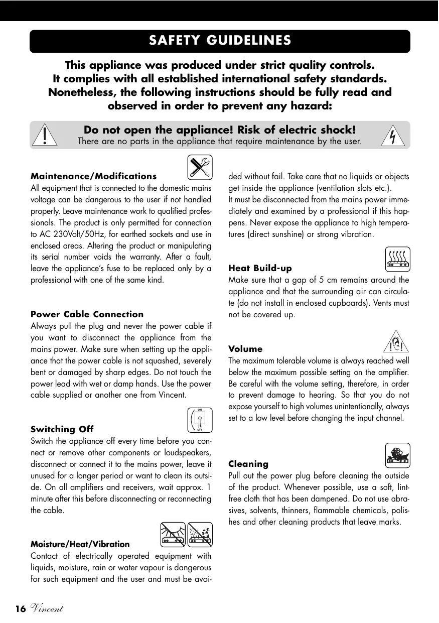 If there are open questions your audio specialist dealer will help you. He also represents your contact person in case of needed warranty service or repairs after the warranty period and is interested to hear from your experiences with Vincent products.