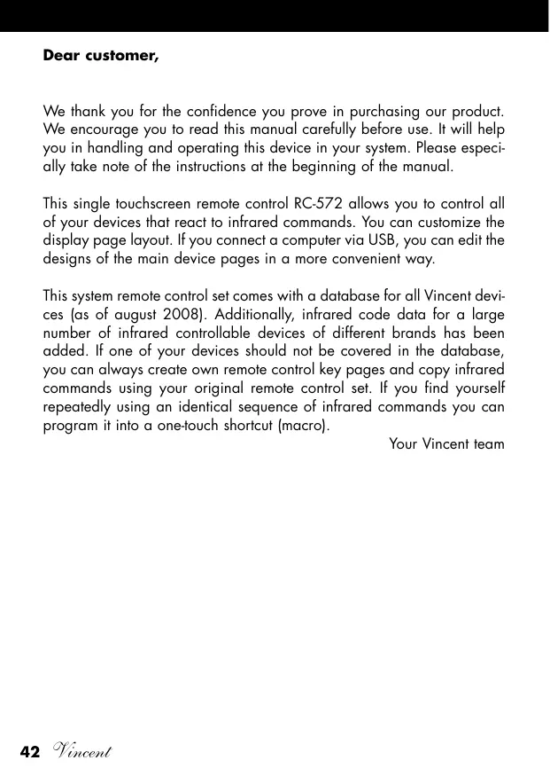 Dear customer, We thank you for the confidence you prove in purchasing our product. We encourage you to read this manual carefully before use. It will help you in handling and operating this device in your system. Please especially take note of the instructions at the beginning of the manual. This single touchscreen remote control RC-572 allows you to control all of your devices that react to infrared commands. You can customize the display page layout. If you connect a computer via USB, you can edit the designs of the main device pages in a more convenient way. This system remote control set comes with a database for all Vincent devices (as of august 2008). Additionally, infrared code data for a large number of infrared controllable devices of different brands has been added. If one of your devices should not be covered in the database, you can always create own remote control key pages and copy infrared commands using your original remote control set. If you find yourself repeatedly using an identical sequence of infrared commands you can program it into a one-touch shortcut (macro). Your Vincent team