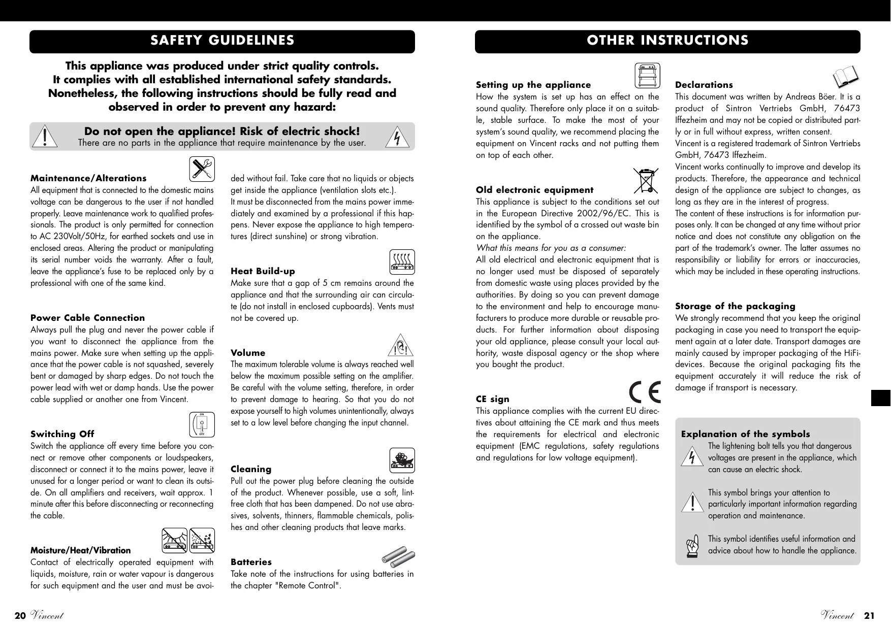 If there are open questions your audio specialist dealer will help you. He also represents your contact person in case of needed warranty service or repairs after the warranty period and is interested to hear from your experiences with Vincent products.