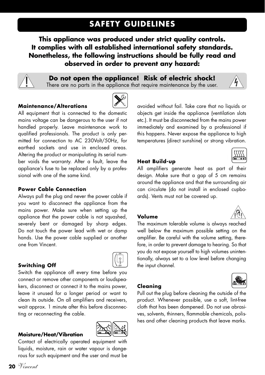 If there are open questions your audio specialist dealer will help you. He also represents your contact person in case of needed warranty service or repairs after the warranty period and is interested to hear from your experiences with Vincent products.