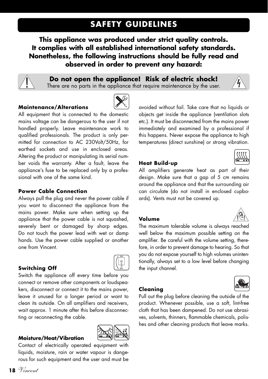 If there are open questions your audio specialist dealer will help you. He also represents your contact person in case of needed warranty service or repairs after the warranty period and is interested to hear from your experiences with Vincent products.