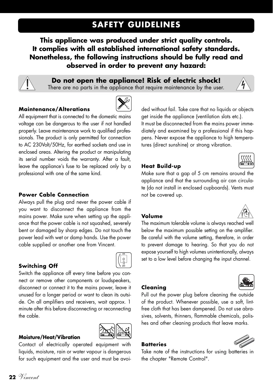 If there are open questions your audio specialist dealer will help you. He also represents your contact person in case of needed warranty service or repairs after the warranty period and is interested to hear from your experiences with Vincent products.