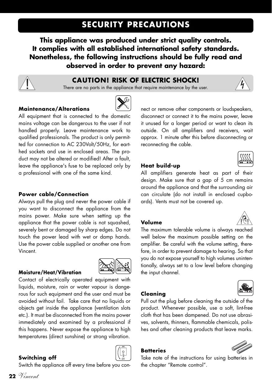 SECURITY PRECAUTIONS This appliance was produced under strict quality controls. It complies with all established international safety standards. Nonetheless, the following instructions should be fully read and observed in order to prevent any hazard: CAUTION! RISK OF ELECTRIC SHOCK! There are no parts in the appliance that require maintenance by the user. Maintenance/Alterations All equipment that is connected to the domestic mains voltage can be dangerous to the user if not handled properly. Leave maintenance work to qualified professionals. The product is only permitted for connection to AC 230Volt/50Hz, for earthed sockets and use in enclosed areas. The product may not be altered or modified! After a fault, leave the appliance's fuse to be replaced only by a professional with one of the same kind. Power cable/Connection Always pull the plug and never the power cable if you want to disconnect the appliance from the mains power. Make sure when setting up the appliance that the power cable is not squashed, severely bent or damaged by sharp edges. Do not touch the power lead with wet or damp hands. Use the power cable supplied or another one from Vincent. Moisture/Heat/Vibration Contact of electrically operated equipment with liquids, moisture, rain or water vapour is dangerous for such equipment and the user and must be avoided without fail. Take care that no liquids or objects get inside the appliance (ventilation slots etc.). It must be disconnected from the mains power immediately and examined by a professional if this happens. Never expose the appliance to high temperatures (direct sunshine) or strong vibration. nect or remove other components or loudspeakers, disconnect or connect it to the mains power, leave it unused for a longer period or want to clean its outside. On all amplifiers and receivers, wait approx. 1 minute after this before disconnecting or reconnecting the cable. Heat build-up All amplifiers generate heat as part of their design. Make sure that a gap of 5 cm remains around the appliance and that the surrounding air can circulate (do not install in enclosed cupboards). Vents must not be covered up. Volume The maximum tolerable volume is always reached well below the maximum possible setting on the amplifier. Be careful with the volume setting, therefore, in order to prevent damage to hearing. So that you do not expose yourself to high volumes unintentionally, always set to a low level before changing the input channel. Cleaning Pull out the plug before cleaning the outside of the product. Whenever possible, use a soft, lint-free cloth that has been dampened. Do not use abrasives, solvents, thinners, flammable chemicals, polishes and other cleaning products that leave marks.