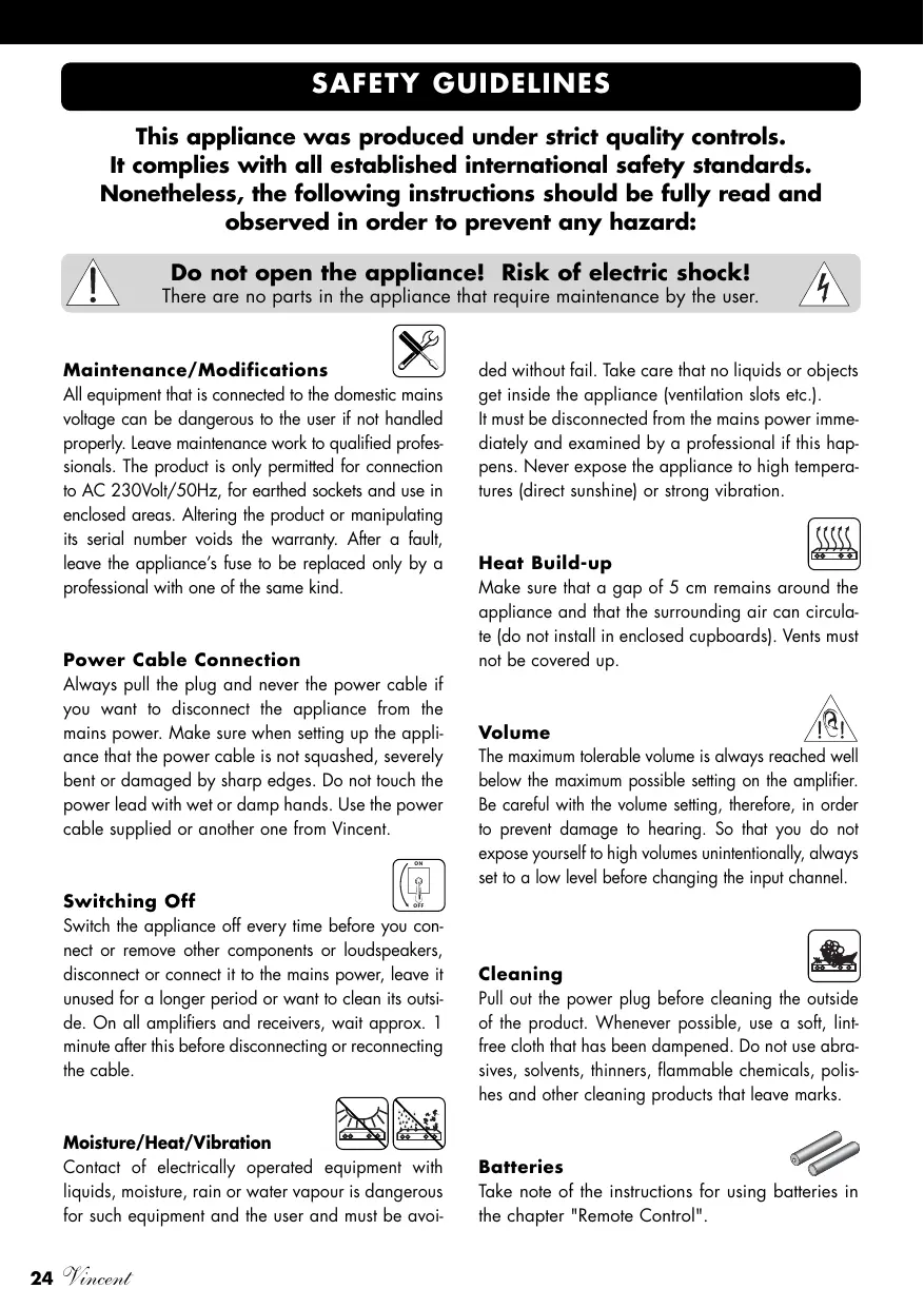 Vincent Cleaning Pull out the power plug before cleaning the outside of the product. Whenever possible, use a soft, lintfree cloth that has been dampened. Do not use abrasives, solvents, thinners, flammable chemicals, polishes and other cleaning products that leave marks. Batteries Take note of the instructions for using batteries in the chapter "Remote Control". OTHER INSTRUCTIONS Setting up the appliance How the system is set up has an effect on the sound quality. Therefore only place it on a suitable, stable surface. To make the most of your system’s sound quality, we recommend placing the equipment on Vincent racks and not putting them on top of each other. Old electronic equipment This appliance is subject to the conditions set out in the European Directive 2002/96/EC. This is identified by the symbol of a crossed out waste bin on the appliance. What this means for you as a consumer: All old electrical and electronic equipment that is no longer used must be disposed of separately from domestic waste using places provided by the authorities. By doing so you can prevent damage to the environment and help to encourage manufacturers to produce more durable or reusable products. For further information about disposing your old appliance, please consult your local authority, waste disposal agency or the shop where you bought the product. CE sign This appliance complies with the current EU directives about attaining the CE mark and thus meets the requirements for electrical and electronic equipment (EMC regulations, regulations and regulations for low voltage equipment). Declarations This document was written by Andreas Böer. It is a product of Sintron Vertriebs GmbH, 76473 Iffezheim and may not be copied or distributed partly or in full without express, written consent. Vincent is a registered trademark of Sintron Vertriebs GmbH, 76473 Iffezheim. Vincent works continually to improve and develop its products. Therefore, the appearance and technical design of the appliance are subject to changes, as long as they are in the interest of progress. The content of these instructions is for information purposes only. It can be changed at any time without prior notice and does not constitute any obligation on the part of the trademark’s owner. The latter assumes no responsibility or liability for errors or inaccuracies, which may be included in these operating instructions. Storage of the packaging We strongly recommend that you keep the original packaging in case you need to transport the equipment again at a later date. Transport damages are mainly caused by improper packaging of the HiFidevices. Because the original packaging fits the equipment accurately it will reduce the risk of damage if transport is necessary. Explanation of the symbols The lightening bolt tells you that dangerous voltages are present in the appliance, which can cause an electric shock. This symbol brings your attention to particularly important information regarding operation and maintenance. This symbol identifies useful information and advice about how to handle the appliance. Vincent