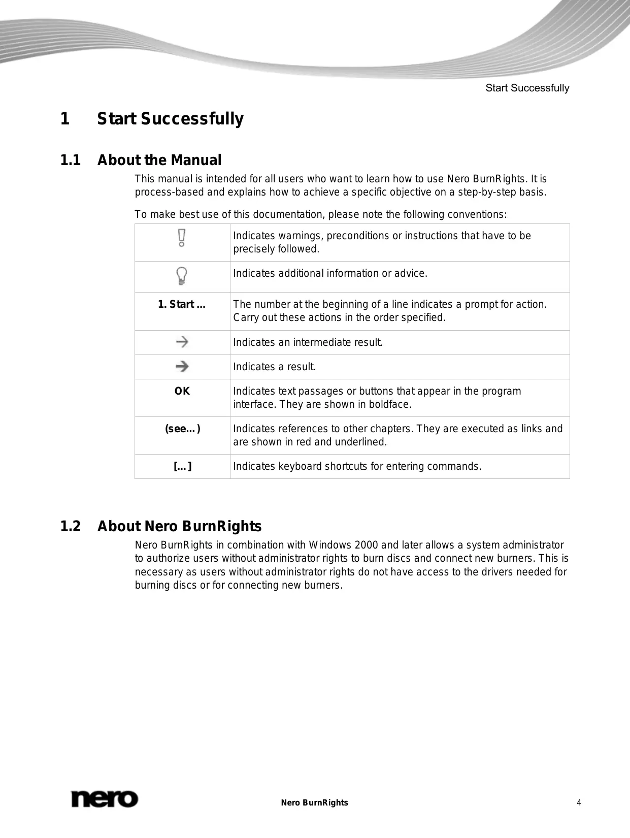 Carry outthese actions in the order specified. 4 Indicates an intermediate result. > Indicates a result. Ok Indicates text passages or buttons that appear in the program interface. They are shown in boldface. (see...) Indicates references to other chapters. They are executed as links and are shown in red and underlined. [..] Indicates keyboard shortcuts for entering commands. 12 About Nero BurnRights Nero BurnRights in combination with Windows 2000 and later allows a system administrator to authorize users without administrator rights to burn discs and connect new burners. This is necessary as users without administrator rights do not have access to the drivers needed for burning discs or for connecting new burners. nero Nero BurnRights