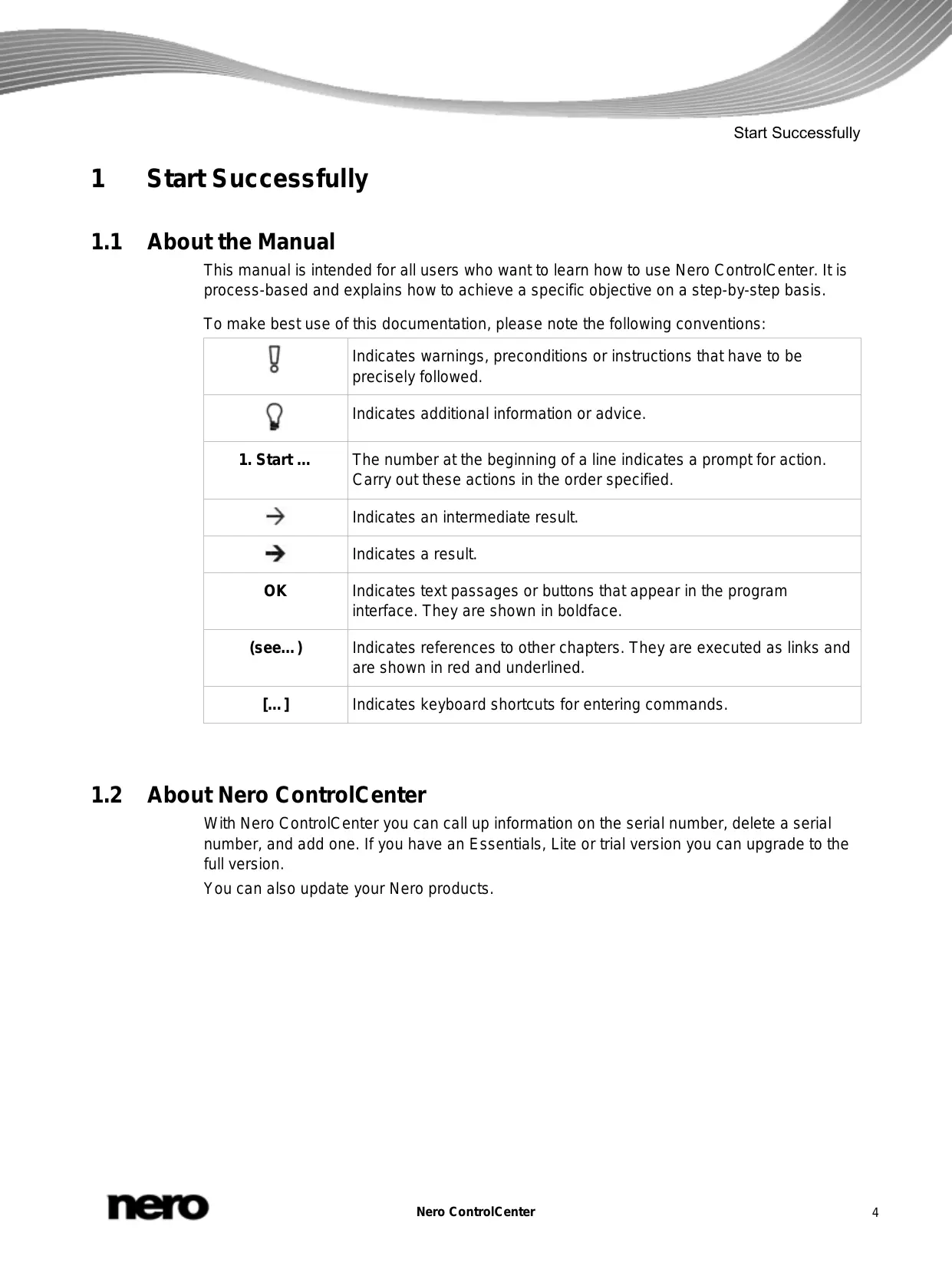 This manual is intended for all users who want to learn how to use Nero ControlCenter. Itis process-based and explains how to achieve a specific objective on a step-by-step basis. To make best use of this documentation, please note the following conventions: Indicates warnings, preconditions or instructions that have to be precisely followed. Indicates additional information or advice. The number at the beginning of a line indicates a prompt for action. Carry outthese actions in the order specified. Indicates an intermediate result. Indicates a result. Indicates text passages or buttons that appear in the program interface. They are shown in boldface. Indicates references to other chapters. They are executed as links and are shown in red and underlined. Indicates keyboard shortcuts for entering commands.