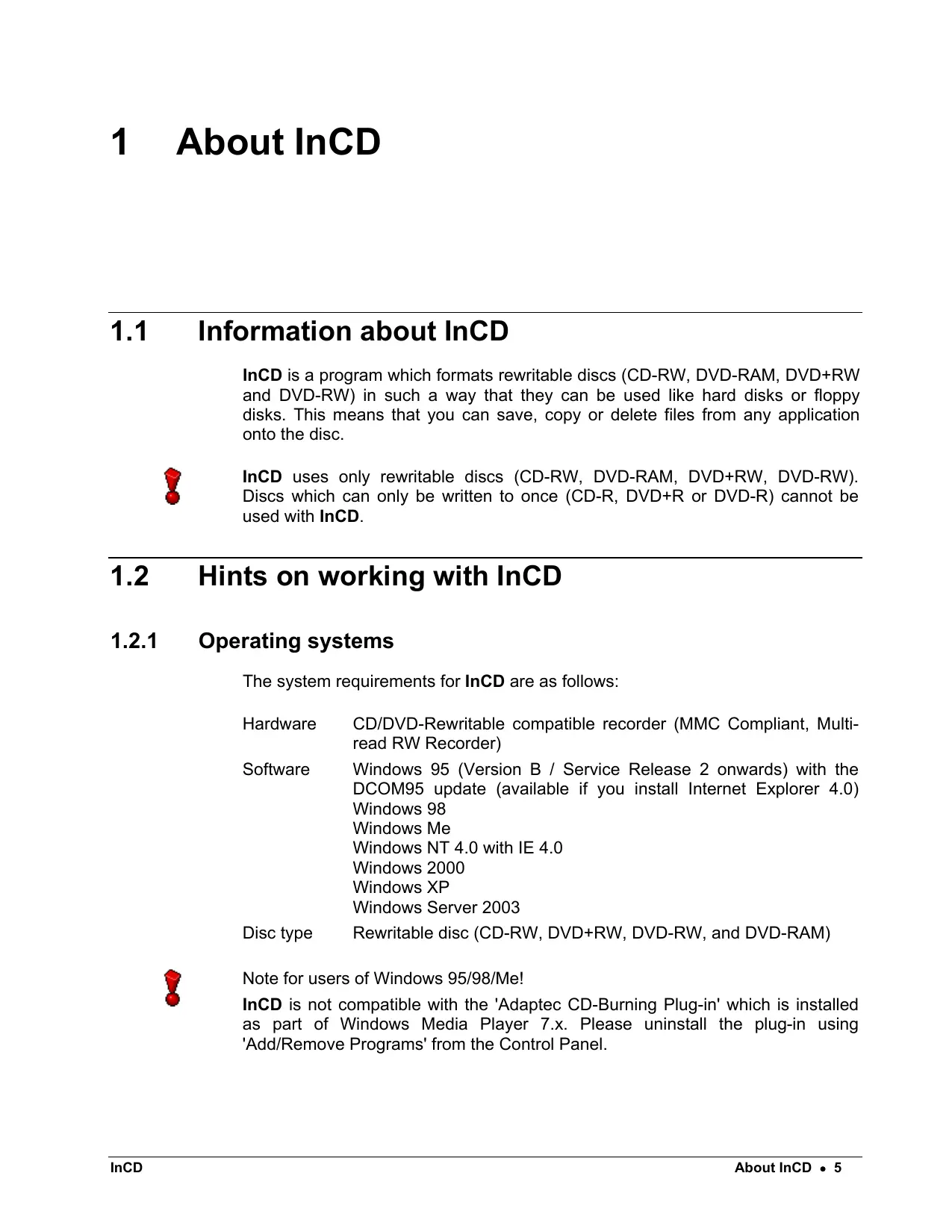 The system requirements for InCD are as follows: Hardware CD/DVD-Rewritable compatible recorder (MMC Compliant, Multi- read RW Recorder) Software Windows 95 (Version B / Service Release 2 onwards) with the DCOM95 update (available if you install Internet Explorer 4.0) Windows 98 Windows Me Windows NT 4.0 with IE 4.0 Windows 2000 Windows XP Windows Server 2003 Disc type Rewritable disc (CD-RW, DVD+RW, DVD-RW, and DVD-RAM) Ÿ Note for users of Windows 95/98/Mel InCD is not compatible with the ‘Adaptec CD-Burning Plug-in' which is installed as part of Windows Media Player 7.x. Please uninstall the plug-in using ‘Add/Remove Programs’ from the Control Panel. InCD About InCD + 5