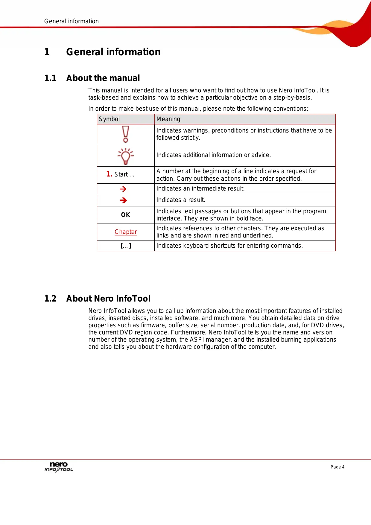 This manual is intended for all users who want to find out how to use Nero InfoTool. Itis task-based and explains how to achieve à particular objective on a step-by-basis. In order to make best use of this manual, please note the following conventions: Symbol Meaning Indicates warnings, preconditions or instructions that have to be followed strictly. Indicates additional information or advice. A number at the beginning of a line indicates a request for action. Carry out these actions in the order specified. Indicates an intermediate result. Indicates a result. Indicates text passages or buttons that appear in the program interface. They are shown in bold face. Indicates references to other chapters. They are executed as links and are shown in red and underlined. Indicates keyboard shortcuts for entering commandés.