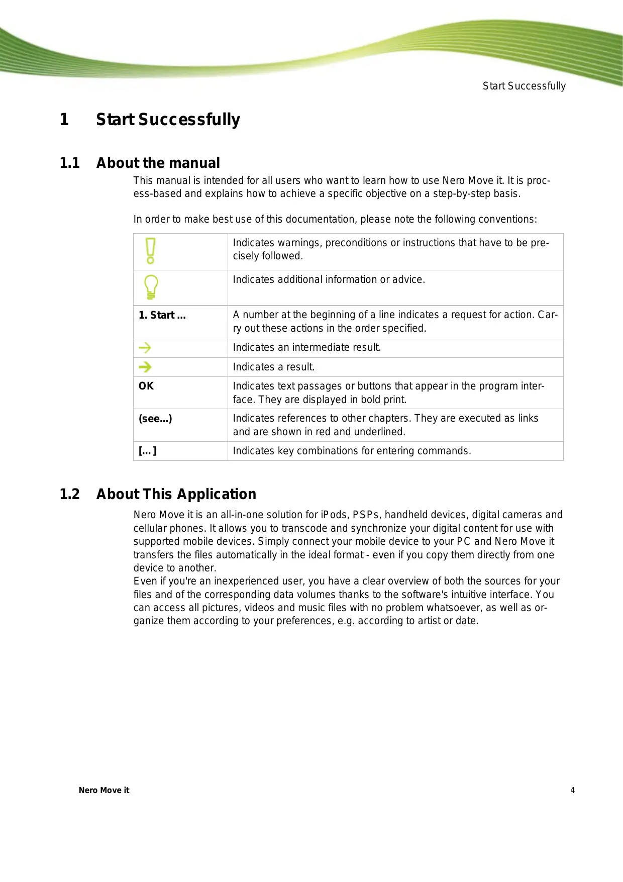 Start Successfully 1 StartSuccessfully 11 Aboutthe manual This manual is intended for all users who want to learn how to use Nero Move it. Itis proc- ess-based and explains how to achieve a specific objective on a step-by-step basis. In order to make best use of this documentation, please note the following conventions: Indicates warnings, preconditions or instructions that have to be pre- cisely followed. Indicates additional information or advice. A number at the beginning of a line indicates a request for action. Car- ry out these actions in the order specified. Indicates an intermediate result. Indicates a result. Indicates text passages or buttons that appear in the program inter- face. They are displayed in bold print. Indicates references to other chapters. They are executed as links and are shown in red and underlined. Indicates key combinations for entering commands. 12 AboutThis Application Nero Move itis an all-in-one solution for iPods, PSPs, handheld devices, digital cameras and cellular phones. It allows you to transcode and synchronize your digital content for use with supported mobile devices. Simply connect your mobile device to your PC and Nero Move it transfers the files automatically in the ideal format - even if you copy them directly from one device to another. Even if you're an inexperienced user, you have a clear overview of both the sources for your files and of the corresponding data volumes thanks to the software's intuitive interface. You can access all pictures, videos and music files with no problem whatsoever, as well as or- ganize them according to your preferences, e.g. according to artist or date. Nero Move it