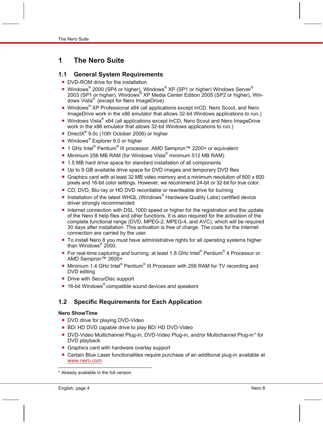 The Nero Suite General System Requirements DVD-ROM drive for the installation Windows” 2000 (SP4 or higher), Windows® XP (SP1 or higher) Windows Server” 2003 (SP1 or higher), Windows® XP Media Center Edition 2005 (SP2 or higher), Win- dows Vista? (except for Nero ImageDrive) Windows® XP Professional x64 (all applications except InCD, Nero Scout, and Nero ImageDrive work in the x86 emulator that allows 32-bit Windows applications to run.) Windows Vista” x64 (all applications except InCD, Nero Scout and Nero ImageDrive work in the x86 emulator that allows 32-bit Windows applications to run.) DirectX® 9.0c (10th October 2006) or higher Windows® Explorer 6.0 or higher 1 GHz Intel” Pentium” III processor, AMD Sempron" 2200+ or equivalent Minimum 256 MB RAM (for Windows Vista® minimum 512 MB RAM)