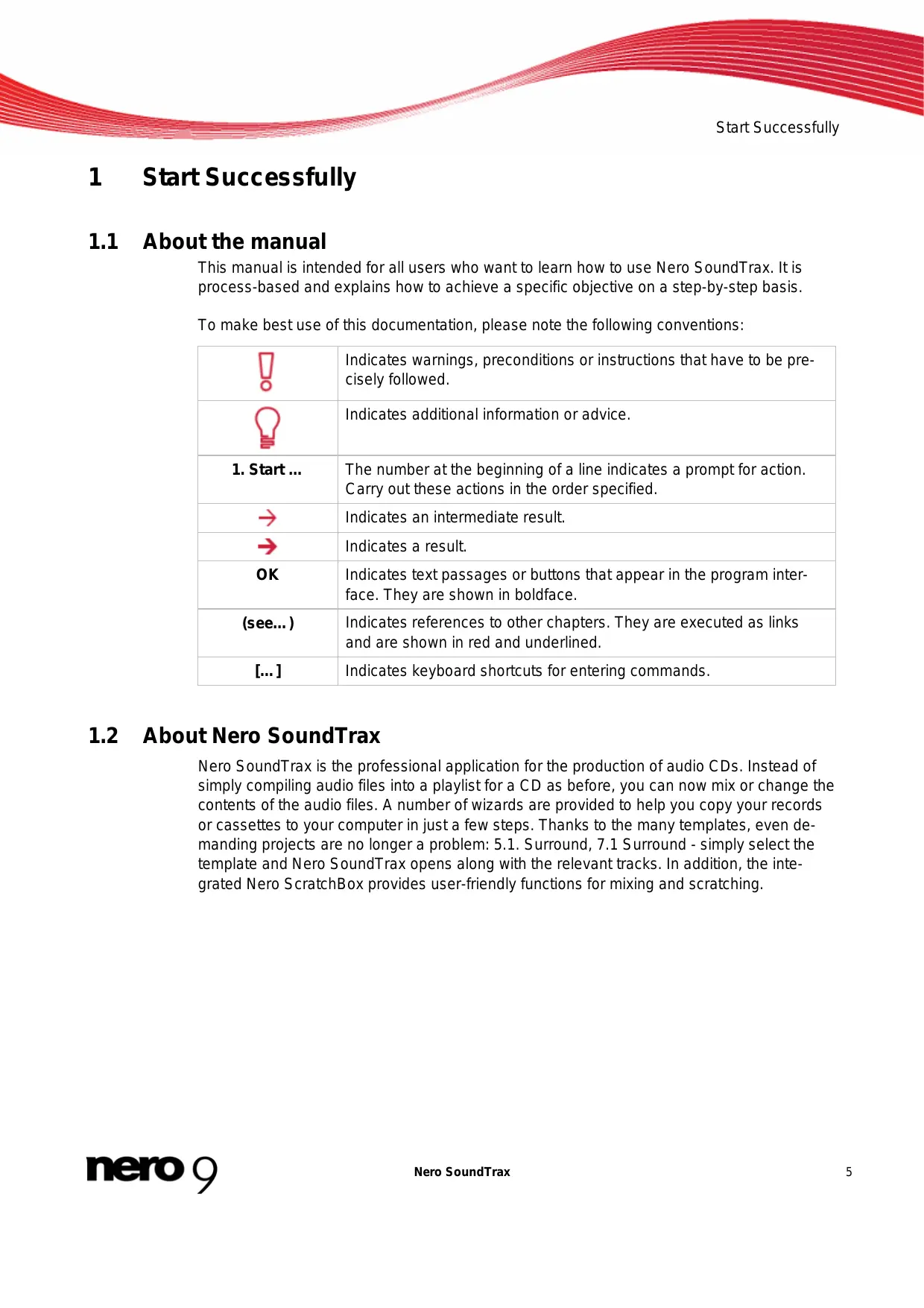 Start Successfully 1 Start Successfully 11 Aboutthe manual This manual is intended for all users who want to learn how to use Nero SoundTrax. It is process-based and explains how to achieve a specific objective on a step-by-step basis. To make best use of this documentation, please note the following conventions: fl Indicates warnings, preconditions or instructions that have to be pre- Ô cisely followed. Q Indicates additional information or advice.