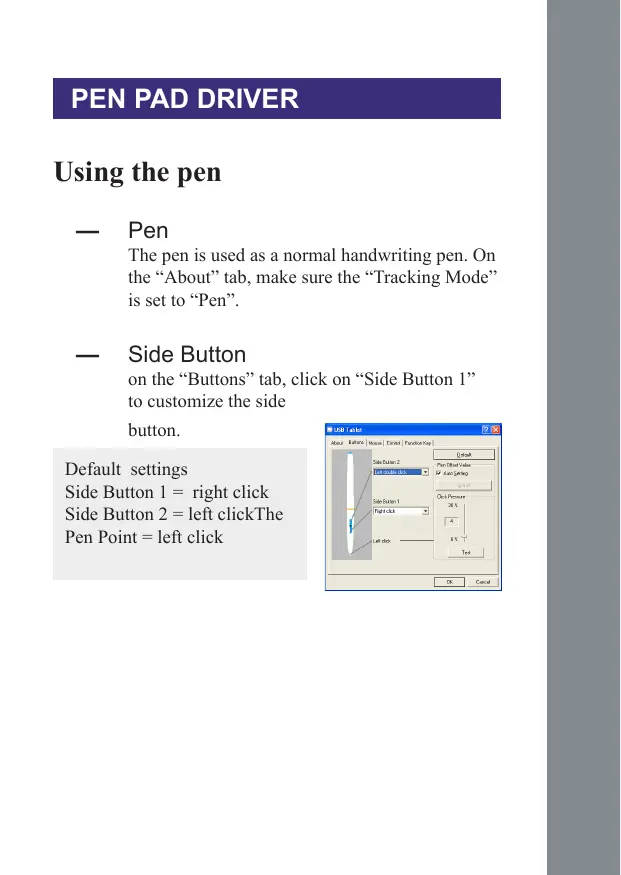 Using the pen — Pen The pen is used as a normal handwriting pen. On the “About” tab, make sure the “Tracking Mode” is set to “Pen”. — Side Button on the “Buttons” tab, click on “Side Button 1” to customize the side button. Default settings Side Button 1 = right click Side Button 2 = left clickThe Pen Point = left click