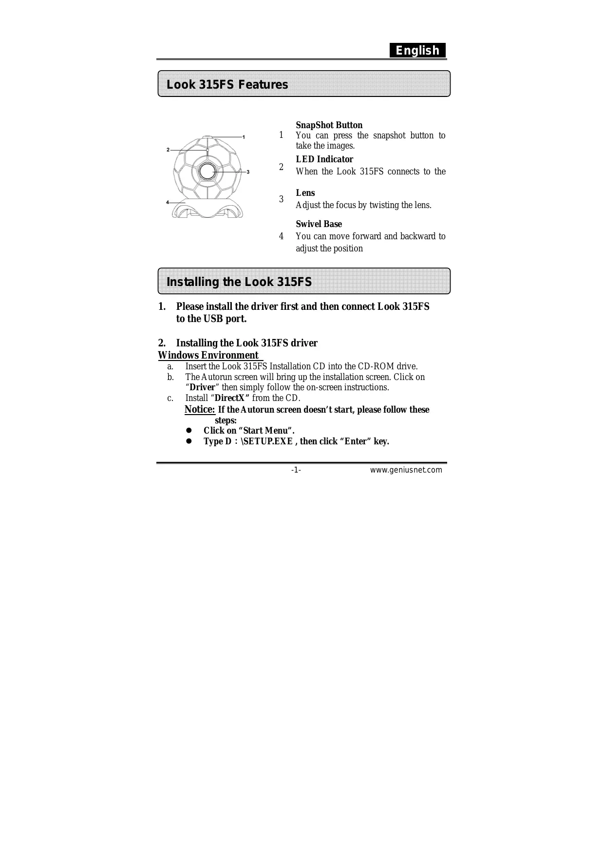 Windows Environment a Insertthe Look 315FS Installation CD into the CD-ROM drive. b. The Autorun screen will bring up the installation screen. Click on “Driver” then simply follow the on-screen instructions. c. Install “DirectX” from the CD. Notice: If the Autorun screen doesn't start, please follow these steps: e Click on “Start Menu”. e TypeD : \SETUPEXE, then click “Enter” key. Eu www.geniusnet.com