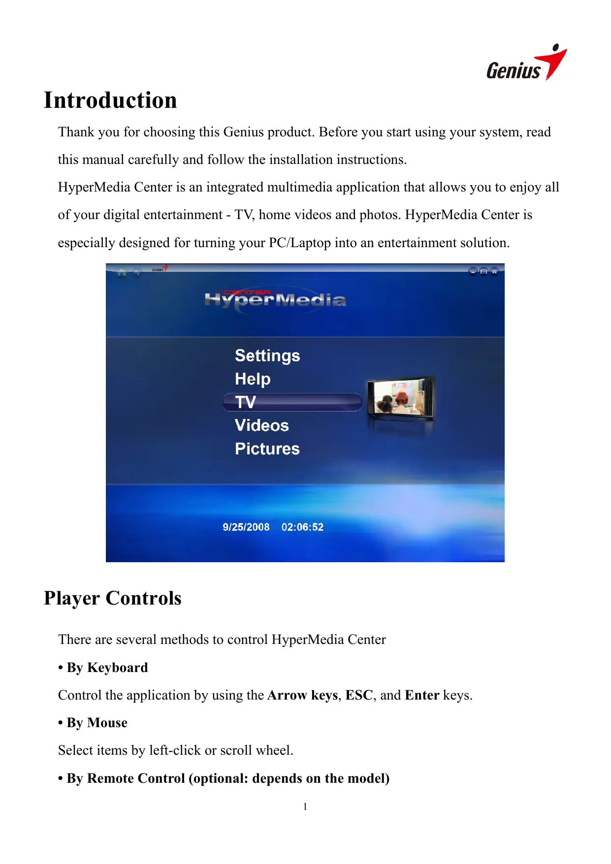 Genius Ÿ Thank you for choosing this Genius product. Before you start using your system, read Introduction this manual carefully and follow the installation instructions. HyperMedia Center is an integrated multimedia application that allows you to enjoy all of your digital entertainment - TV, home videos and photos. HyperMedia Center is especially designed for turning your PC/Laptop into an entertainment solution. LuvmarAiari:- Settings Help