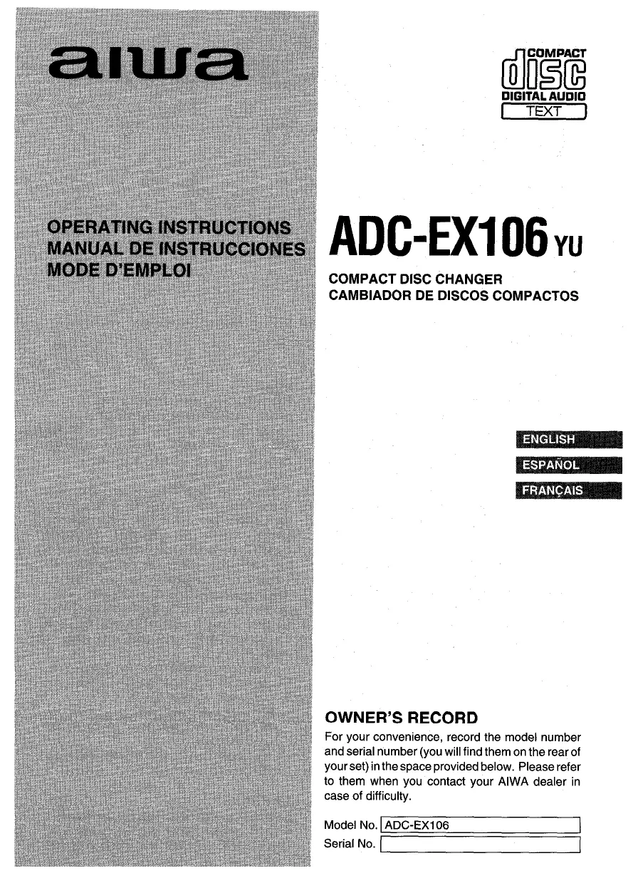 Download the instructions for your CD Player in PDF format for free! Find your manual ADC-EX106 - AIWA and take your electronic device back in hand. On this page are published all the documents necessary for the use of your device. ADC-EX106 by AIWA.