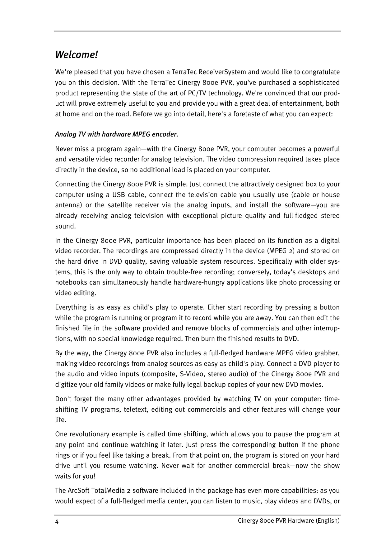 Welcome! We're pleased that you have chosen a TerraTec ReceiverSystem and would like to congratulate you on this decision. With the TerraTec Cinergy 800e PVR, you've purchased a sophisticated product representing the state of the art of PC/TV technology. We're convinced that our prod- uct will prove extremely useful to you and provide you with a great deal of entertainment, both at home and on the road. Before we go into detail, here's a foretaste of what you can expect: Analog TV with hardware MPEG encoder. Never miss a program again—with the Cinergy 800e PVR, your computer becomes a powerful and versatile video recorder for analog television. The video compression required takes place directly in the device, so no additional load is placed on your computer. Connecting the Cinergy 800e PVR is simple. Just connect the attractively designed box to your computer using a USB cable, connect the television cable you usually use (cable or house antenna) or the satellite receiver via the analog inputs, and install the software—you are already receiving analog television with exceptional picture quality and full-fledged stereo sound. In the Cinergy 800e PVR, particular importance has been placed on its function as a digital video recorder. The recordings are compressed directly in the device (MPEG 2) and stored on the hard drive in DVD quality, saving valuable system resources. Specifically with older sys- tems, this is the only way to obtain trouble-free recording; conversely, today's desktops and notebooks can simultaneously handle hardware-hungry applications like photo processing or video editing. Everything is as easy as child's play to operate. Either start recording by pressing a button while the program is running or program it to record while you are away. You can then edit the finished file in the software provided and remove blocks of commercials and other interrup- tions, with no special knowledge required. Then burn the finished results to DVD. By the way, the Cinergy 800e PVR also includes a full-fledged hardware MPEG video grabber, making video recordings from analog sources as easy as child's play. Connect a DVD player to the audio and video inputs (composite, S-Video, stereo audio) of the Cinergy 800e PVR and digitize your old family videos or make fully legal backup copies of your new DVD movies. Don't forget the many other advantages provided by watching TV on your computer: time- shifting TV programs, teletext, editing out commercials and other features will change your life. One revolutionary example is called time shifting, which allows you to pause the program at any point and continue watching it later. Just press the corresponding button if the phone rings or if you feel like taking a break. From that point on, the program is stored on your hard drive until you resume watching. Never wait for another commercial break—now the show waits for you! The ArcSoft TotalMedia 2 software included in the package has even more capabilities: as you would expect of a full-fledged media center, you can listen to music, play videos and DVDs, or 4 Cinergy 800e PVR Hardware (English)