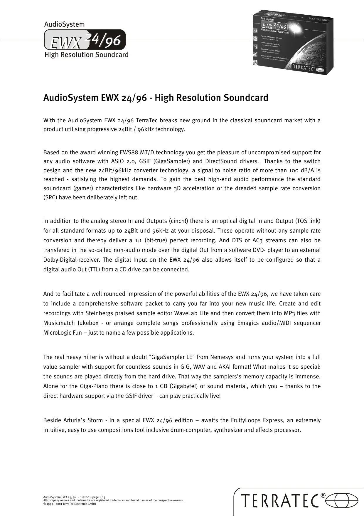 AudioSystem High Resolution Soundcard AudioSystem EWX 24/96 - High Resolution Soundcard With the AudioSystem EWX 24/96 TerraTec breaks new ground in the classical soundcard market with a product utilising progressive 24Bit / 96kHz technology. Based on the award winning EWS88 MT/D technology you get the pleasure of uncompromised support for any audio software with ASIO 2.0, GSIF (GigaSampler) and DirectSound drivers. Thanks to the switch design and the new 24Bit/96kHz converter technology, a signal to noise ratio of more than 100 dB/A is reached - satisfying the highest demands. To gain the best high-end audio performance the standard soundcard (gamer) characteristics like hardware 3D acceleration or the dreaded sample rate conversion (SRC) have been deliberately left out. In addition to the analog stereo In and Outputs (cinch!) there is an optical digital In and Output (TOS link) for all standard formats up to 24Bit und 96kHz at your disposal. These operate without any sample rate conversion and thereby deliver a 1:1 (bit-true) perfect recording. And DTS or AC3 streams can also be transfered in the so-called non-audio mode over the digital Out from a software DVD- player to an external Dolby-Digital-receiver. The digital Input on the EWX 24/96 also allows itself to be configured so that a digital audio Out (TTL) from a CD drive can be connected. And to facilitate a well rounded impression of the powerful abilities of the EWX 24/96, we have taken care to include a comprehensive software packet to carry you far into your new music life. Create and edit recordings with Steinbergs praised sample editor WaveLab Lite and then convert them into MP3 files with Musicmatch Jukebox - or arrange complete songs professionally using Emagics audio/MIDI sequencer MicroLogic Fun -— just to name a few possible applications. The real heavy hitter is without a doubt "GigaSampler LE" from Nemesys and turns your system into a full value sampler with support for countless sounds in GIG, WAV and AKAI format! What makes it so special: the sounds are played directly from the hard drive. That way the samplers's memory capacity is immense. Alone for the Giga-Piano there is close to 1 GB (Gigabyte!) of sound material, which you — thanks to the direct hardware support via the GSIF driver — can play practically live! Beside Arturia's Storm - in a special EWX 24/96 edition — awaits the FruityLoops Express, an extremely intuitive, easy to use compositions tool inclusive drum-computer, synthesizer and effects processor. Audiosystem EWX 24/96 = 11/2001 page 3 ® Al company names ani trademark ar egstred trademarks and brand names of their respecte ouners. D a994- 2004 Tera Electron Gb