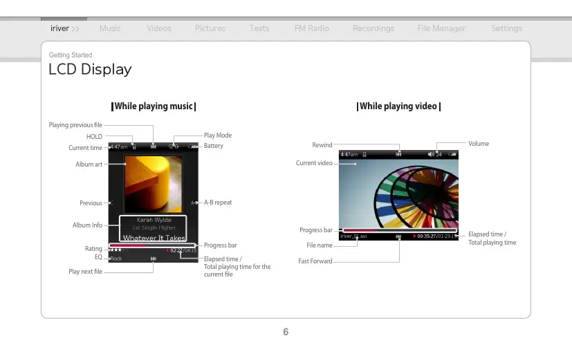 Contents Getting Started Components 4 Locating the Controls 5 LCD Display 6 Installing iriver plus 3 8 Basic Operations Turning the Product on/off 10 Menu selection 11 Using HOLD and RESET 12 Connecting Products 13 Using the Product Music 20 Videos 23 Pictures 25 Texts 27 FM Radio 29 Recordings 31 File Manager 32 Settings 33 Other Information iriver plus 3 Using the Product 36 Copyrights/Certification/ Trademarks/Limited Liability 40 Safety Instructions 41 Troubleshooting 44