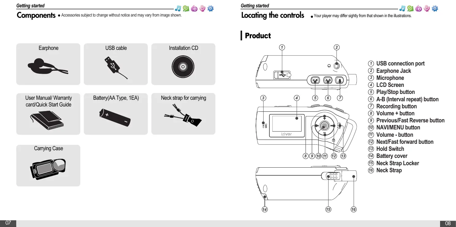 User Manual! Warranty card/Quick Start Guide Neck strap for carrying Getting started 3060%% Locating the controls «Your payer may diersghty rom rat shoumin re stations | Product @ USB connection port @ Earphone Jack © Microphone @ LCD Screen © Play/Stop button © A:B (Interval repeat) button @ Recording button Volume + button © Previous/Fast Reverse button @) NAVI/MENU button @) Volume - button @) Next/Fast forward button @) Hold Switch @) Battery cover €) Neck Strap Locker Neck Strap