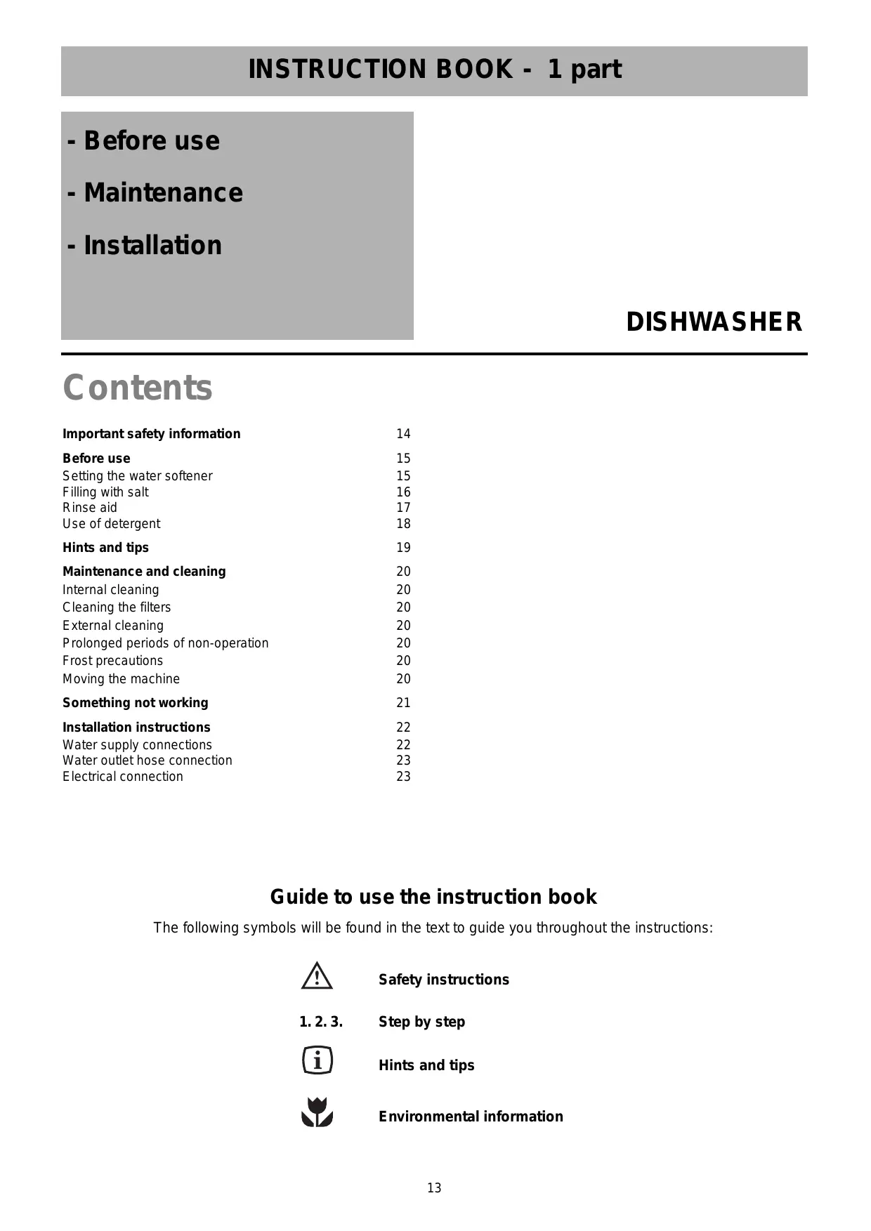 DISHWASHER Contents Important safety information Before use Setting the water softener Filing with salt Rinse aid Use of detergent Hints and tips Maintenance and cleaning Internal cleaning Cleaning the filters External cleaning Prolonged periods of non-operation Frost precautions Moving the machine Something not working Installation instructions Water supply connections Water outlet hose connection Electrical connection Guide to use the instruction book The following symbols will be found in the text to guide you throughout the instructions: Safety instructions Step by step Hints and tips Environmental information