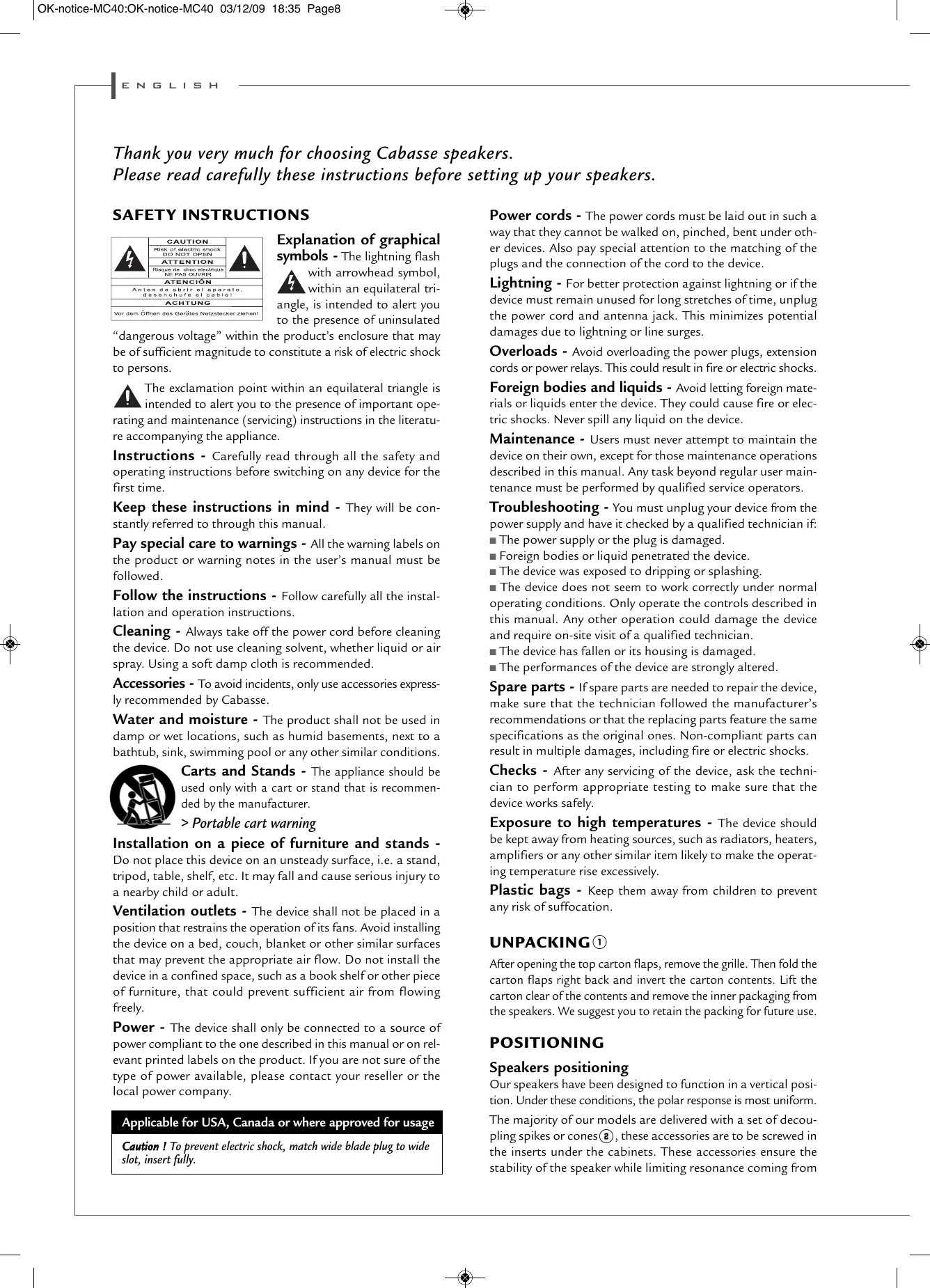 Explanation of graphical symbols - The lightning flash with arrowhead symbol, within an equilateral triangle, is intended to alert you to the presence of uninsulated “dangerous voltage” within the product’s enclosure that may be of sufficient magnitude to constitute a risk of electric shock to persons. The exclamation point within an equilateral triangle is intended to alert you to the presence of important operating and maintenance (servicing) instructions in the literature accompanying the appliance. Instructions - Carefully read through all the safety and operating instructions before switching on any device for the first time. Keep these instructions in mind - They will be constantly referred to through this manual. Pay special care to warnings - All the warning labels on the product or warning notes in the user’s manual must be followed. Follow the instructions - Follow carefully all the installation and operation instructions. Cleaning - Always take off the power cord before cleaning the device. Do not use cleaning solvent, whether liquid or air spray. Using a soft damp cloth is recommended. Accessories - To avoid incidents, only use accessories expressly recommended by Cabasse. Water and moisture - The product shall not be used in damp or wet locations, such as humid basements, next to a bathtub, sink, swimming pool or any other similar conditions. Carts and Stands - The appliance should be used only with a cart or stand that is recommended by the manufacturer. > Portable cart warning Installation on a piece of furniture and stands Do not place this device on an unsteady surface, i.e. a stand, tripod, table, shelf, etc. It may fall and cause serious injury to a nearby child or adult. Ventilation outlets - The device shall not be placed in a position that restrains the operation of its fans. Avoid installing the device on a bed, couch, blanket or other similar surfaces that may prevent the appropriate air flow. Do not install the device in a confined space, such as a book shelf or other piece of furniture, that could prevent sufficient air from flowing freely. Power - The device shall only be connected to a source of power compliant to the one described in this manual or on relevant printed labels on the product. If you are not sure of the type of power available, please contact your reseller or the local power company. Applicable for USA, Canada or where approved for usage Caution ! To prevent electric shock, match wide blade plug to wide slot, insert fully. Power cords - The power cords must be laid out in such a way that they cannot be walked on, pinched, bent under other devices. Also pay special attention to the matching of the plugs and the connection of the cord to the device. Lightning - For better protection against lightning or if the device must remain unused for long stretches of time, unplug the power cord and antenna jack. This minimizes potential damages due to lightning or line surges. Overloads - Avoid overloading the power plugs, extension cords or power relays. This could result in fire or electric shocks. Foreign bodies and liquids - Avoid letting foreign materials or liquids enter the device. They could cause fire or electric shocks. Never spill any liquid on the device. Maintenance - Users must never attempt to maintain the device on their own, except for those maintenance operations described in this manual. Any task beyond regular user maintenance must be performed by qualified service operators. Troubleshooting - You must unplug your device from the power supply and have it checked by a qualified technician if: ■ The power supply or the plug is damaged. ■ Foreign bodies or liquid penetrated the device. ■ The device was exposed to dripping or splashing. ■ The device does not seem to work correctly under normal operating conditions. Only operate the controls described in this manual. Any other operation could damage the device and require on-site visit of a qualified technician. ■ The device has fallen or its housing is damaged. ■ The performances of the device are strongly altered. Spare parts - If spare parts are needed to repair the device, make sure that the technician followed the manufacturer’s recommendations or that the replacing parts feature the same specifications as the original ones. Non-compliant parts can result in multiple damages, including fire or electric shocks. Checks - After any servicing of the device, ask the technician to perform appropriate testing to make sure that the device works safely. Exposure to high temperatures - The device should be kept away from heating sources, such as radiators, heaters, amplifiers or any other similar item likely to make the operating temperature rise excessively. Plastic bags - Keep them away from children to prevent any risk of suffocation. UNPACKING 1 After opening the top carton flaps, remove the grille. Then fold the carton flaps right back and invert the carton contents. Lift the carton clear of the contents and remove the inner packaging from the speakers. We suggest you to retain the packing for future use. POSITIONING Speakers positioning Our speakers have been designed to function in a vertical position. Under these conditions, the polar response is most uniform. The majority of our models are delivered with a set of decoupling spikes or cones2, these accessories are to be screwed in the inserts under the cabinets. These accessories ensure the stability of the speaker while limiting resonance coming from OK-notice-MC40:OK-notice-MC40 03/12/09 18:35 Page9 e n g l i s h certain types of grounds like wood floors. Speakers are delivered with a front grille to protect drivers. It is possible to use them without this front grille, by gently pulling its top end in order to cut off its magnetic link with the magnets to the front panel. To get the grill back in place, position it in front of the speaker and approach it to the front panel until the magnetic link is effective. Thes