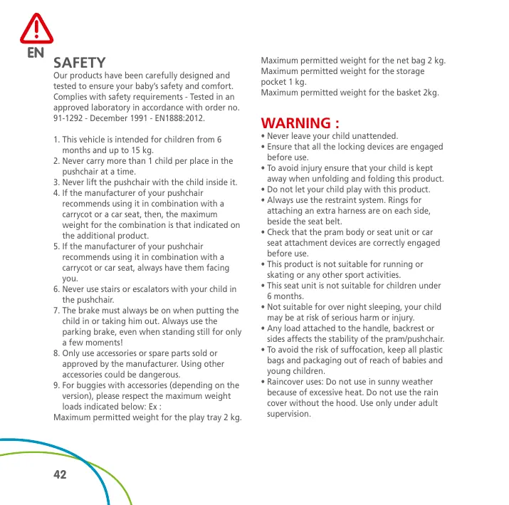 EN SAFETY Our products have been carefully designed and tested to ensure your baby’s safety and comfort. Complies with safety requirements - Tested in an approved laboratory in accordance with order no. 91-1292 - December 1991 - EN1888:2012. 1. This vehicle is intended for children from 6 months and up to 15 kg. 2. Never carry more than 1 child per place in the pushchair at a time. 3. Never lift the pushchair with the child inside it. 4. If the manufacturer of your pushchair recommends using it in combination with a carrycot or a car seat, then, the maximum weight for the combination is that indicated on the additional product. 5. If the manufacturer of your pushchair recommends using it in combination with a carrycot or car seat, always have them facing you. 6. Never use stairs or escalators with your child in the pushchair. 7. The brake must always be on when putting the child in or taking him out. Always use the parking brake, even when standing still for only a few moments! 8. Only use accessories or spare parts sold or approved by the manufacturer. Using other accessories could be dangerous. 9. For buggies with accessories (depending on the version), please respect the maximum weight loads indicated below: Ex : Maximum permitted weight for the play tray 2 kg.