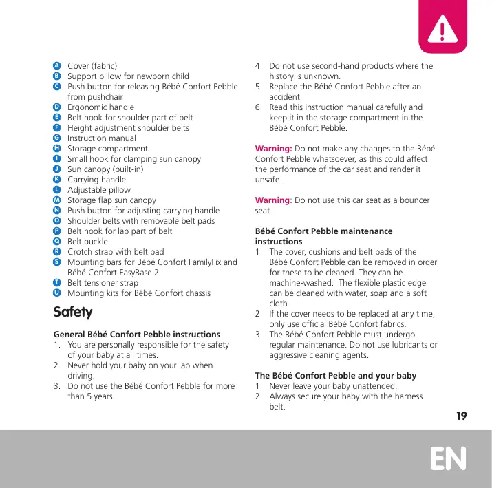 5. Replace the Bébé Confort Pebble after an accident. 6. Read this instruction manual carefully and keep it in the storage compartment in the Bébé Confort Pebble. Warning: Do not make any changes to the Bébé Confort Pebble whatsoever, as this could affect the performance of the car seat and render it unsafe. Warning: Do not use this car seat as a bouncer seat. Bébé Confort Pebble maintenance instructions 1. The cover, cushions and belt pads of the Bébé Confort Pebble can be removed in order for these to be cleaned. They can be machine-washed. The flexible plastic edge can be cleaned with water, soap and a soft cloth. 2. If the cover needs to be replaced at any time, only use official Bébé Confort fabrics. 3. The Bébé Confort Pebble must undergo regular maintenance. Do not use lubricants or aggressive cleaning agents. The Bébé Confort Pebble and your baby 1. Never leave your baby unattended. 2. Always secure your baby with the harness belt.
