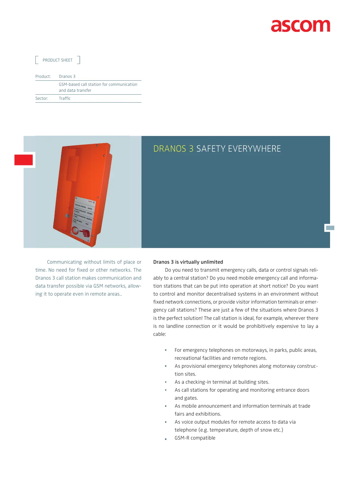 Product: Dranos 3 GSM-based call station for communication and data transfer Sector: Traffic SAFETY EVERYWHERE Communicating without limits of place or Dranos 3 is virtually unlimited time. No need for fixed or other networks. The Do you need to transmit emergency calls, data or control signals reli- Dranos 3 call station makes communication and ably to a central station? Do you need mobile emergency call and informa- data transfer possible via GSM networks, allow- tion stations that can be put into operation at short notice? Do you want ing it to operate even in remote areas. to control and monitor decentralised systems in an environment without fixed network connections, or provide visitor information terminals or emer- gency call stations? These are just a few of the situations where Dranos 3 is the perfect solution! The call station is ideal, for example, wherever there is no landline connection or it would be prohibitively expensive to lay a cable: “ For emergency telephones on motorways, in parks, public areas, recreational facilities and remote regions. “As provisional emergency telephones along motorway construc- tion sites. “As a checking-in terminal at building sites. “As call stations for operating and monitoring entrance doors and gates. “As mobile announcement and information terminals at trade fairs and exhibitions. “As voice output modules for remote access to data via telephone (e.g. temperature, depth of snow etc.) = GSM-R compatible