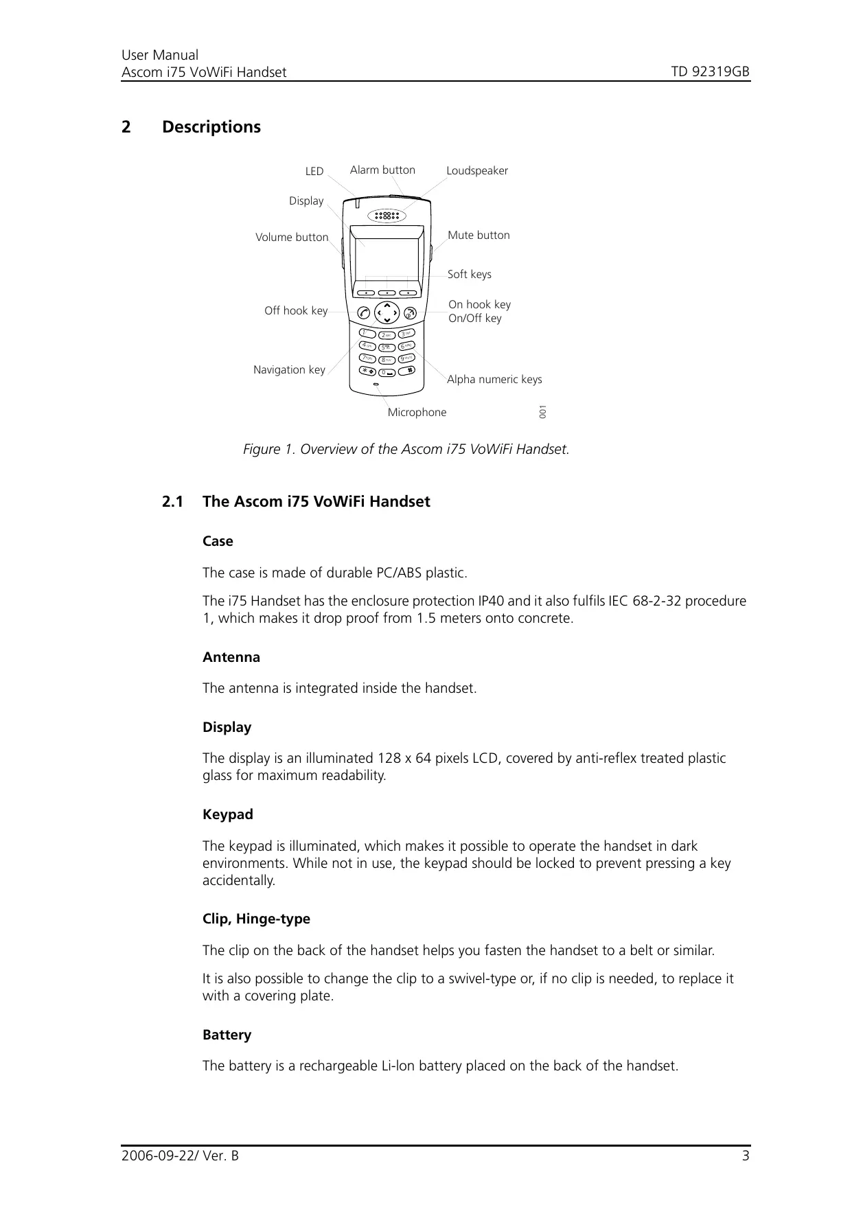 LED Alammbutton Loudspeaker Display Mute button Volume button Soft keys On hook key Off hook key On/Off key Navigation ke 3 ’ Alpha numeric keys Microphone 8 Figure 1. Overview of the Ascom i75 VoWiFi Handset. The Ascom i75 VoWiFi Handset Case The case is made of durable PC/ABS plastic. The i75 Handset has the enclosure protection IP40 and it also fulfils IEC 68-2-32 procedure 1, which makes it drop proof from 1.5 meters onto concrete. Antenna The antenna is integrated inside the handset. Display The display is an illuminated 128 x 64 pixels LCD, covered by anti-reflex treated plastic glass for maximum readability. Keypad The keypad is illuminated, which makes it possible to operate the handset in dark environments. While not in use, the keypad should be locked to prevent pressing a key accidentally. Clip, Hinge-type The clip on the back of the handset helps you fasten the handset to a belt or similar. It is also possible to change the clip to a swivel-type or, if no clip is needed, to replace it With a covering plate. Battery The battery is a rechargeable Li-lon battery placed on the back of the handset. 2006-09-22/ Ver. B 3