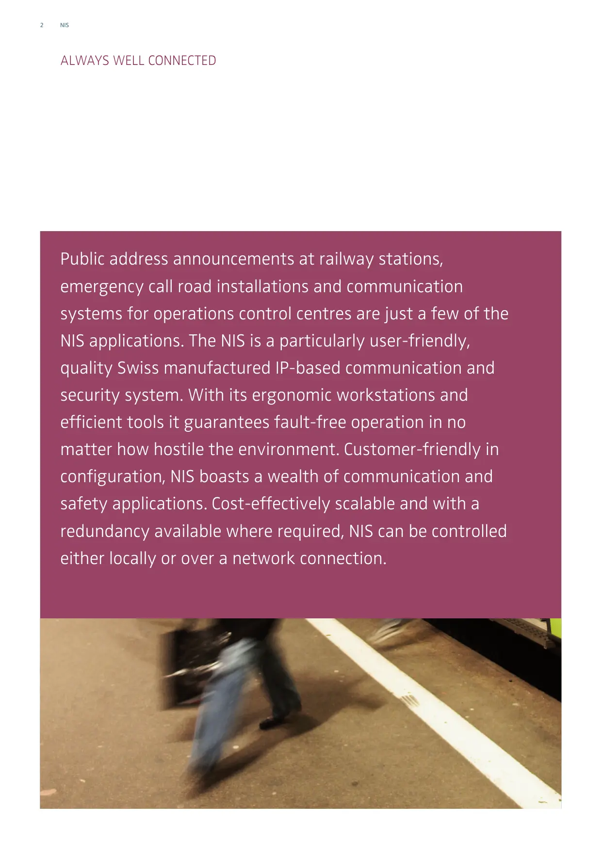 Public address announcements at railway stations, emergency call road installations and communication systems for operations control centres are just a few of the NIS applications. The NIS is a particularly user-friendly, quality Swiss manufactured IP-based communication and security system. With its ergonomic workstations and efficient tools it guarantees fault-free operation in no matter how hostile the environment. Customer-friendly in configuration, NIS boasts a wealth of communication and safety applications. Cost-effectively scalable and with a redundancy available where required, NIS can be controlled either locally or over a network connection.