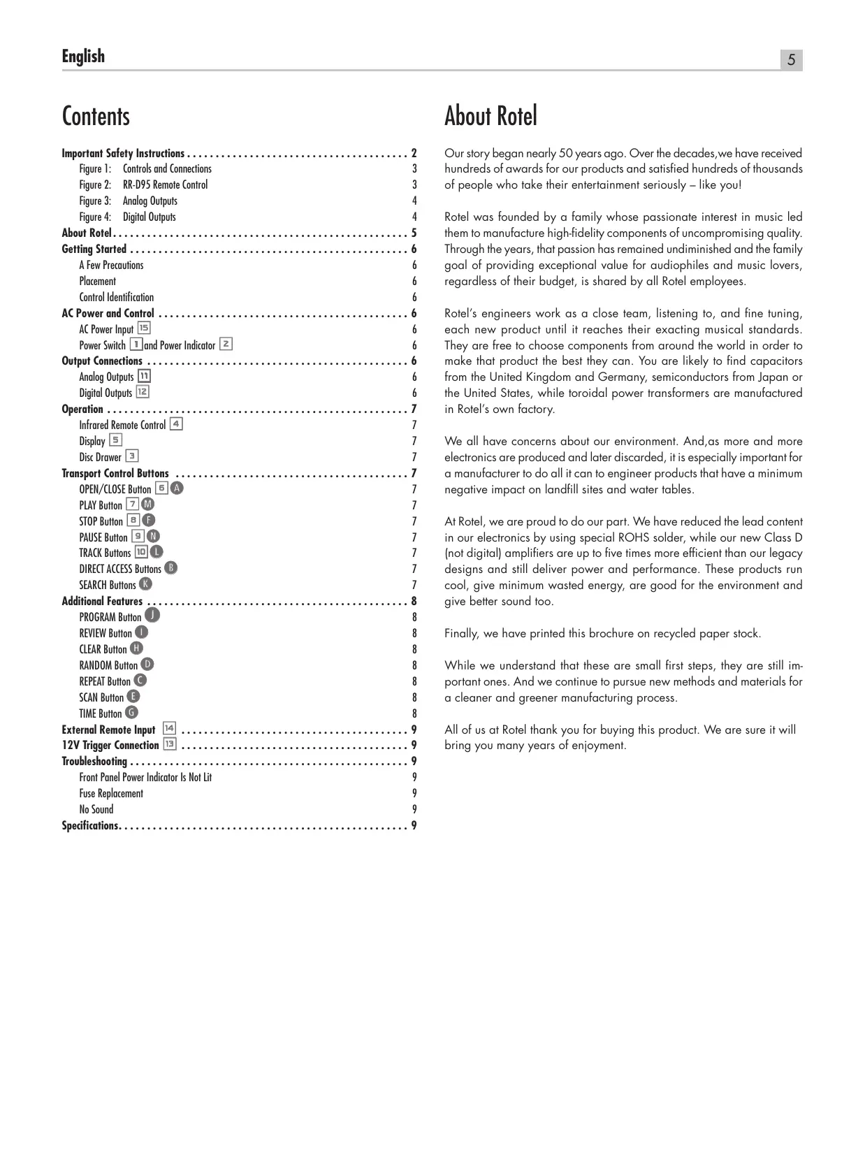 DO NOT EXPOSE THIS EQUIPMENT TO RAIN OR MOISTRUE. Our story began nearly 50 years ago. Over the decades,we have received hundreds of awards for our products and satisfied hundreds of thousands of people who take their entertainment seriously – like you! Rotel was founded by a family whose passionate interest in music led them to manufacture high-fidelity components of uncompromising quality. Through the years, that passion has remained undiminished and the family goal of providing exceptional value for audiophiles and music lovers, regardless of their budget, is shared by all Rotel employees. Rotel’s engineers work as a close team, listening to, and fine tuning, each new product until it reaches their exacting musical standards. They are free to choose components from around the world in order to make that product the best they can. You are likely to find capacitors from the United Kingdom and Germany, semiconductors from Japan or the United States, while toroidal power transformers are manufactured in Rotel’s own factory. We all have concerns about our environment. And,as more and more electronics are produced and later discarded, it is especially important for a manufacturer to do all it can to engineer products that have a minimum negative impact on landfill sites and water tables. At Rotel, we are proud to do our part. We have reduced the lead content in our electronics by using special ROHS solder, while our new Class D (not digital) amplifiers are up to five times more efficient than our legacy designs and still deliver power and performance. These products run cool, give minimum wasted energy, are good for the environment and give better sound too. Finally, we have printed this brochure on recycled paper stock. While we understand that these are small first steps, they are still important ones. And we continue to pursue new methods and materials for a cleaner and greener manufacturing process. All of us at Rotel thank you for buying this product. We are sure it will bring you many years of enjoyment.
