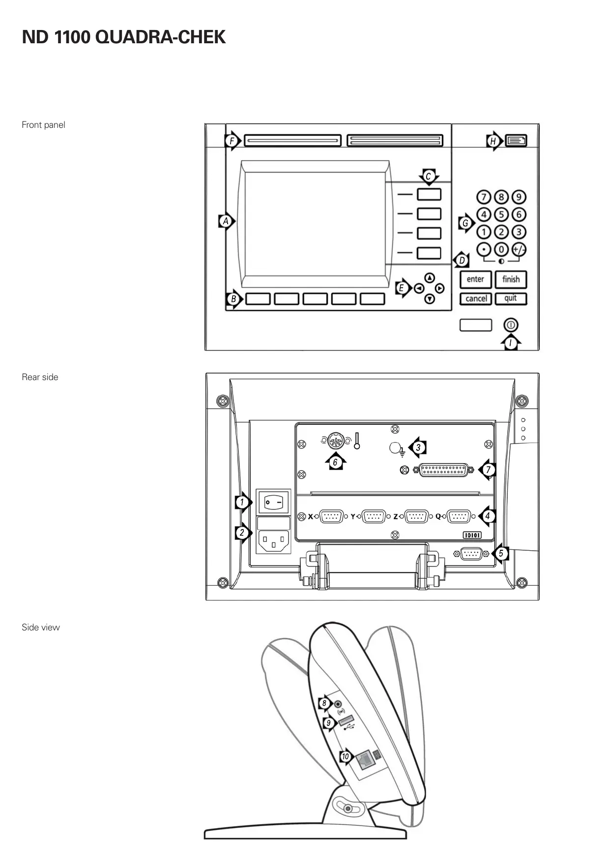 - Never use 3-wire to 2-wire adapters or allow the ground connection to the ND 1100 to be interrupted or disconnected. Caution Changes to the power cable may be made only by an electrical technician. Caution Do not connect encoders or other equipment to the ND 1100 when the power is on. Safety Considerations General accepted safety precautions must be followed when operating the ND 1100. Failure to observe these precautions could result in damage to the equipment, or injury to personnel. It is understood that safety rules within individual companies vary. If a conflict exists between the material contained in this guide or the and the rules of a company using this system, the more stringent rules should take precedence. LCD screen Soft keys: Change to support functions Axis keys: Zero or preset datums Command keys: Control measurement Arrow cursor keys: Menu navigation Fast track keys: Programmable for frequently used functions Numeric keypad: Enter numeric data Send key: Transmit measurement data to PC, USB printer or USB drive LCD on/off key: Turn LCD on or off, clear data, datums and skew alignments Mounting The ND 1100 is secured to the swivel slots of the mounting stand or arm mount by a shoulder screw, a cap screw mount is shown and associated washers. Initial power up Connections rear side