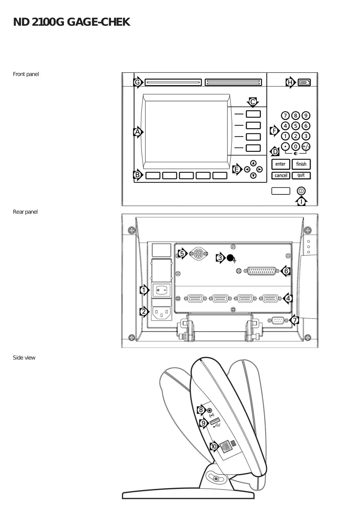 Caution Changes to the power cable may be made only by an electrical technician. Caution Do not connect encoders or other equipment to the ND 2100 G when the power is on. Safety Considerations General accepted safety precautions must be followed when operating the ND 2100 G. Failure to observe these precautions could result in damage to the equipment, or injury to personnel. It is understood that safety rules within individual companies vary. If a conflict exists between the material contained in this guide and the rules of a company using this system, the more stringent rules should take precedence. LCD screen Soft keys change to support functions. Dimension keys display dimension values or graphs. Command keys control measurement activities. Arrow cursor keys for menu navigation. Numeric keypad for entering numeric data. Fast track keys are programmable for frequently used functions. Send key transmits data to a PC, USB printer or USB drive. LCD on/off key turns the LCD on or off or clears stored data. Connections side view