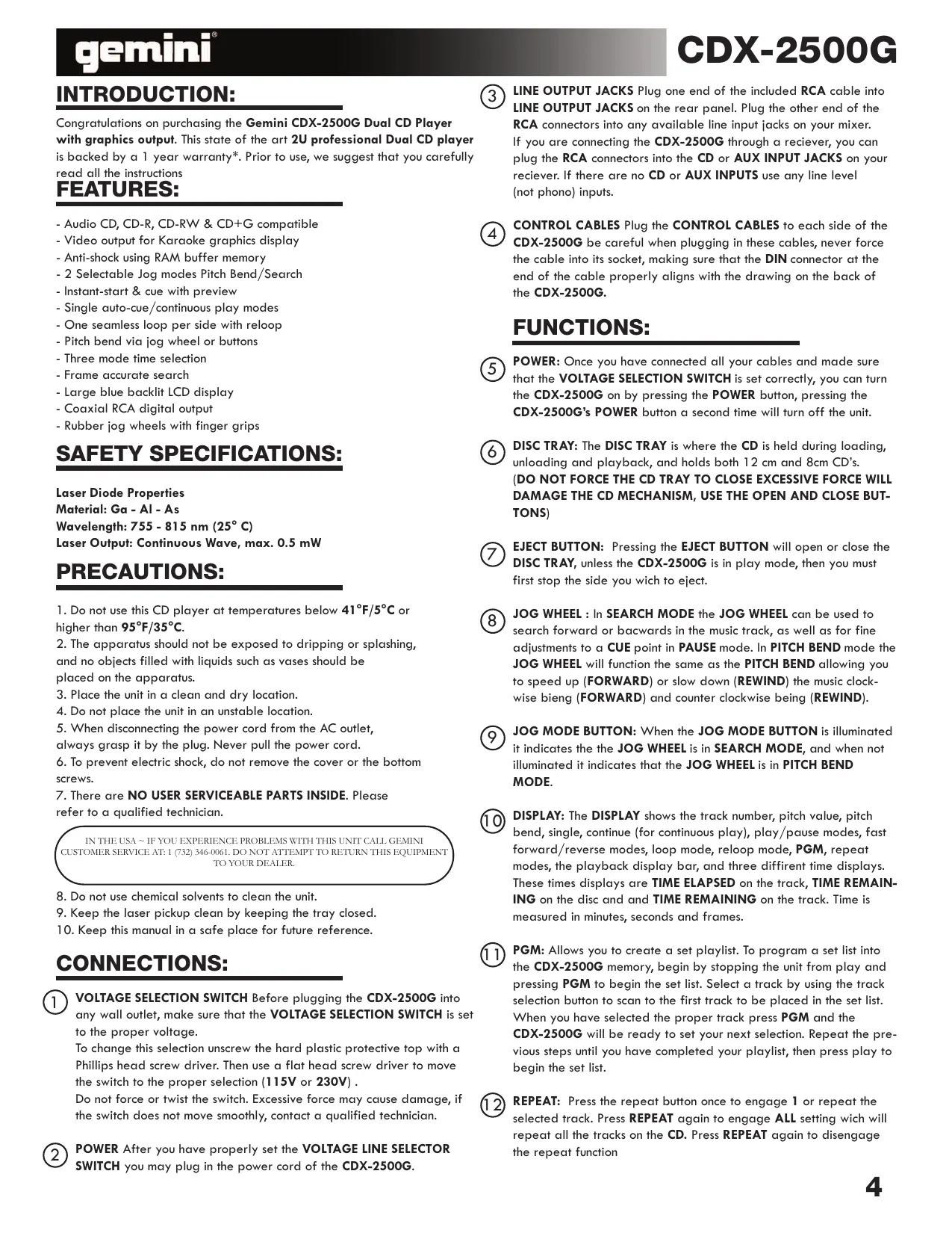 Congratulations on purchasing the Gemini CDX-2500G Dual CD Player with graphics output. This state of the art 2U professional Dual CD player is backed by a 1 year warranty*. Prior to use, we suggest that you carefully read all the instructions