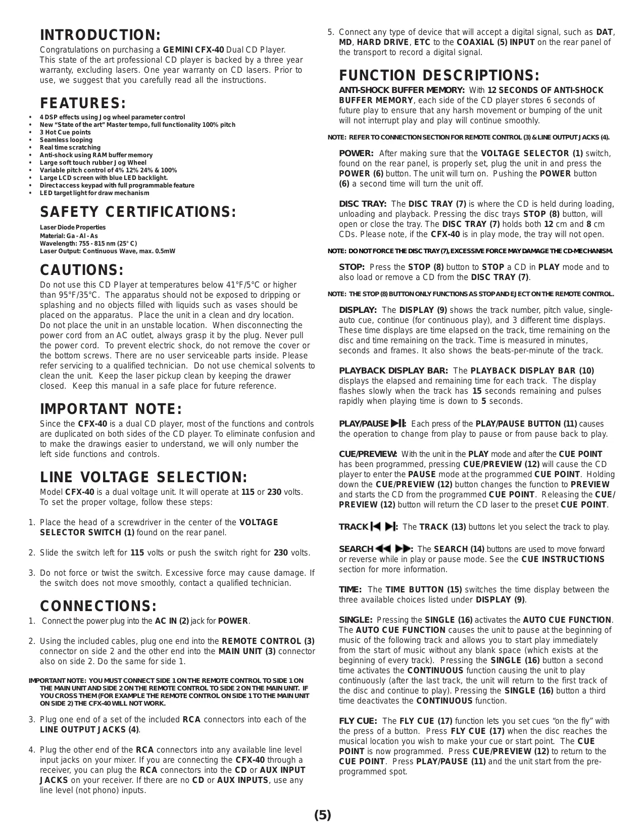 Congratulations on purchasing a GEMINI CFX-40 Dual CD Player. This state of the art professional CD player is backed by a three year warranty, excluding lasers. One year warranty on CD lasers. Prior to use, we suggest that you carefully read all the instructions.