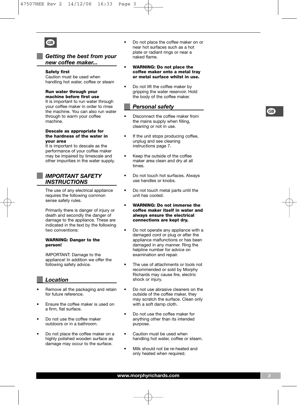 USER MANUAL PUMP ESPRESSO COFFEE MAKER 47507 MORPHY RICHARDS