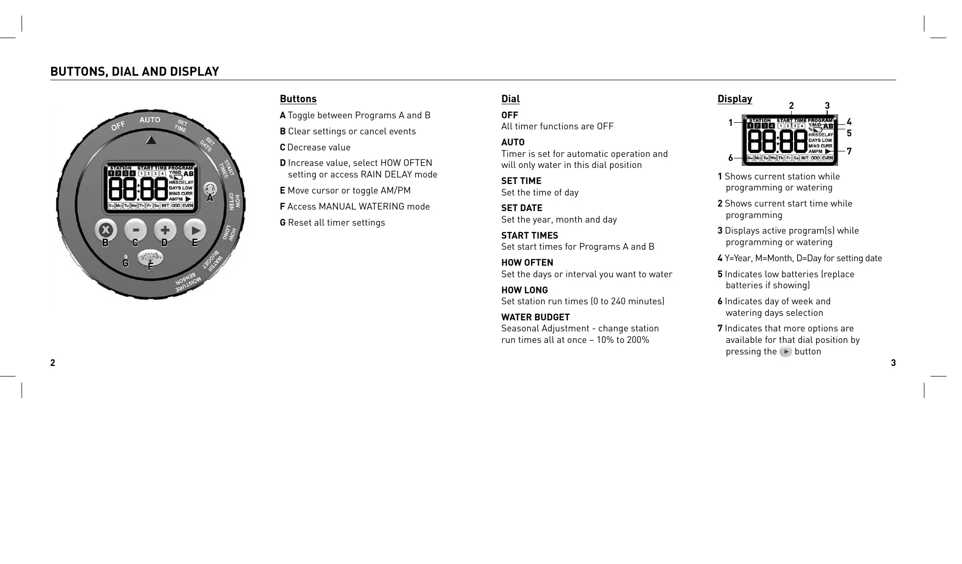 Programming your Timer Press to select the desired days to water: select either days of the week, interval (every 1 to 32 days), or odd/even days. Press ADDITIONAL FEATURES Step 7–Auto Off Press Turn the dial to AUTO. Turn dial to OFF. The set program(s) will run automatically. No watering may occur while in the OFF position. NOTE: The % symbol will show on the screen when the value for A or B is anything other than 100%. Manual Watering Rain Delay To manually run a program: Water Budget Press while dial is in the AUTO position. The timer will run all set programs. Turn dial to WATER BUDGET. NOTE: This feature allows for seasonal adjustments. Turn the dial to HOW LONG. To select only the A or B program, or individual stations: Set the value to 100% to water exactly as programmed. Press to select the desired program. Press Press to select the desired station. Press 240).