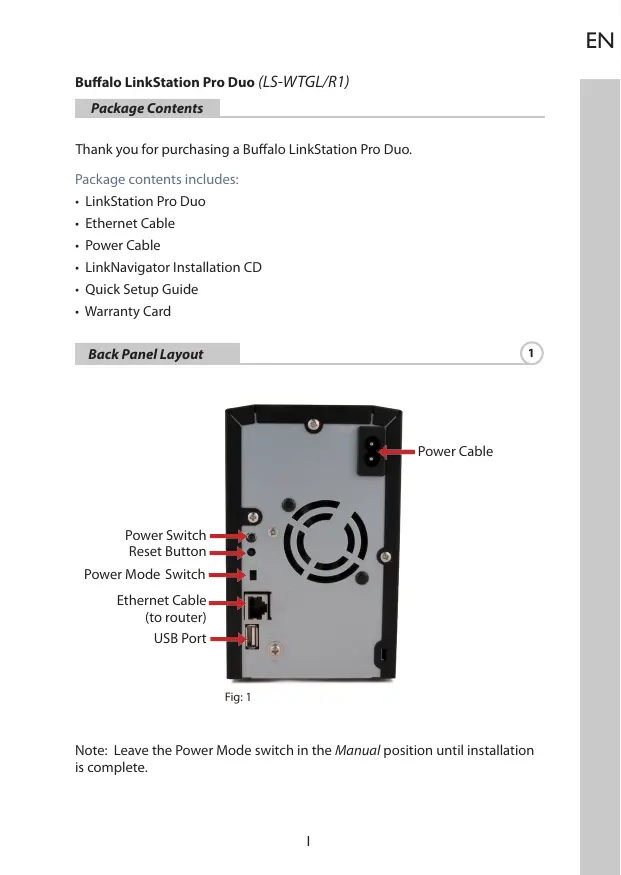 Package Contents Thank you for purchasing a Buffalo LinkStation Pro Duo. Package contents includes: • LinkStation Pro Duo • Ethernet Cable • Power Cable • LinkNavigator Installation CD • Quick Setup Guide • Warranty Card Back Panel Layout
