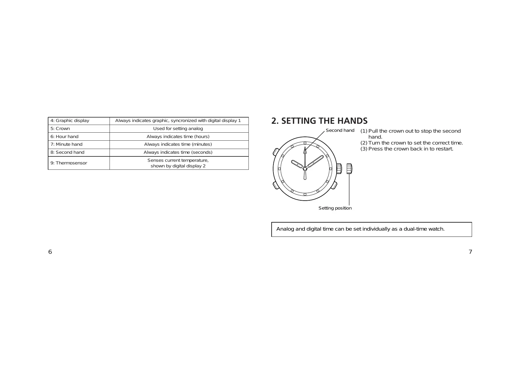 Second hand _ (1) Pull the crown out to stop the second hand. (2) Tum the crown to set the correct time. (3) Press the crown back in to restart. Setting position Analog and digital time can be set individually as a dual-time watch.